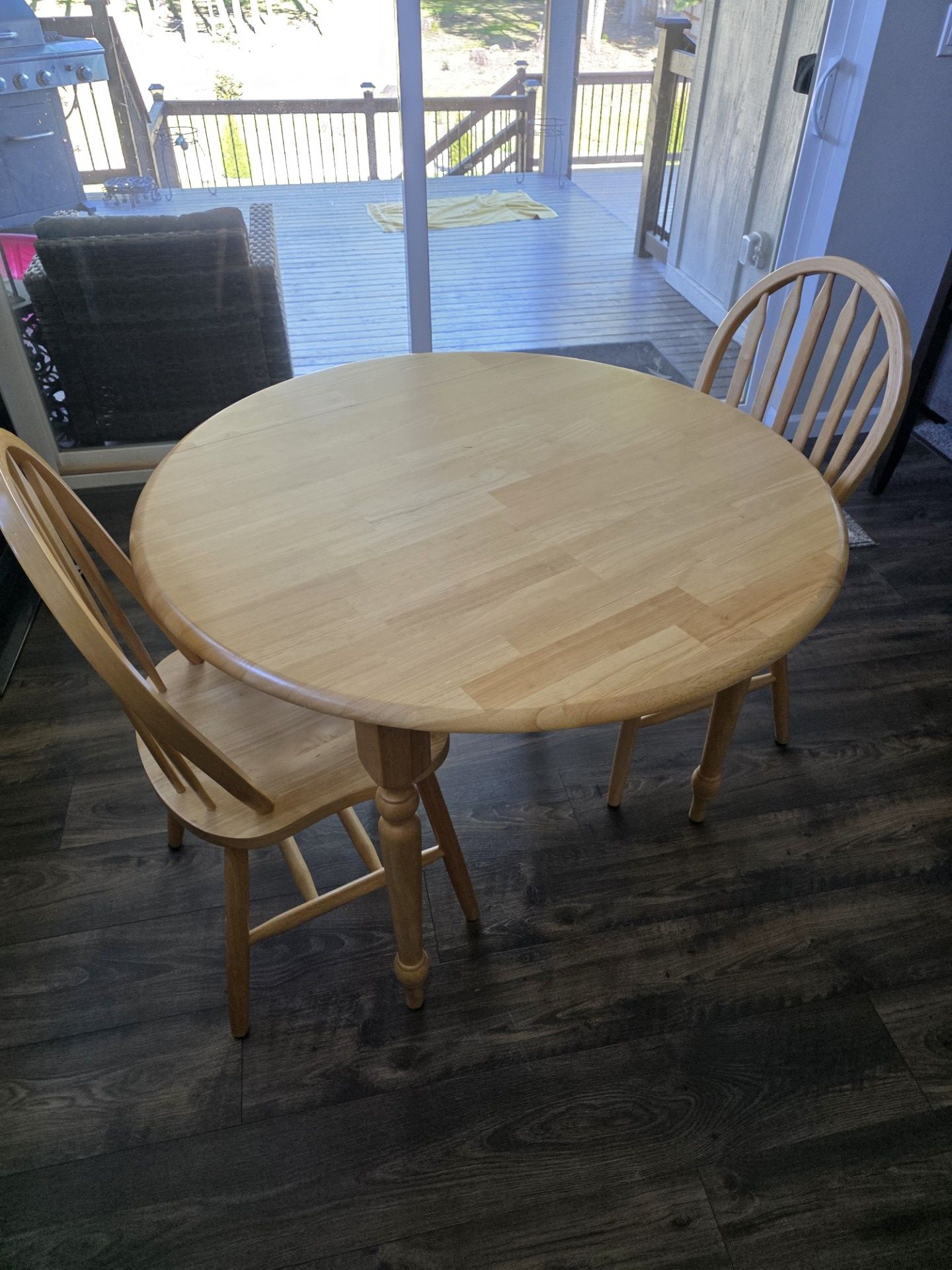 Solid wood light oak color kitchen table with 2 chairs. The table is 40" diameter and 30" tall. It has 2 drop down sleeves on 2 sides that changes the top dimensions to 40" by 26". Good condition