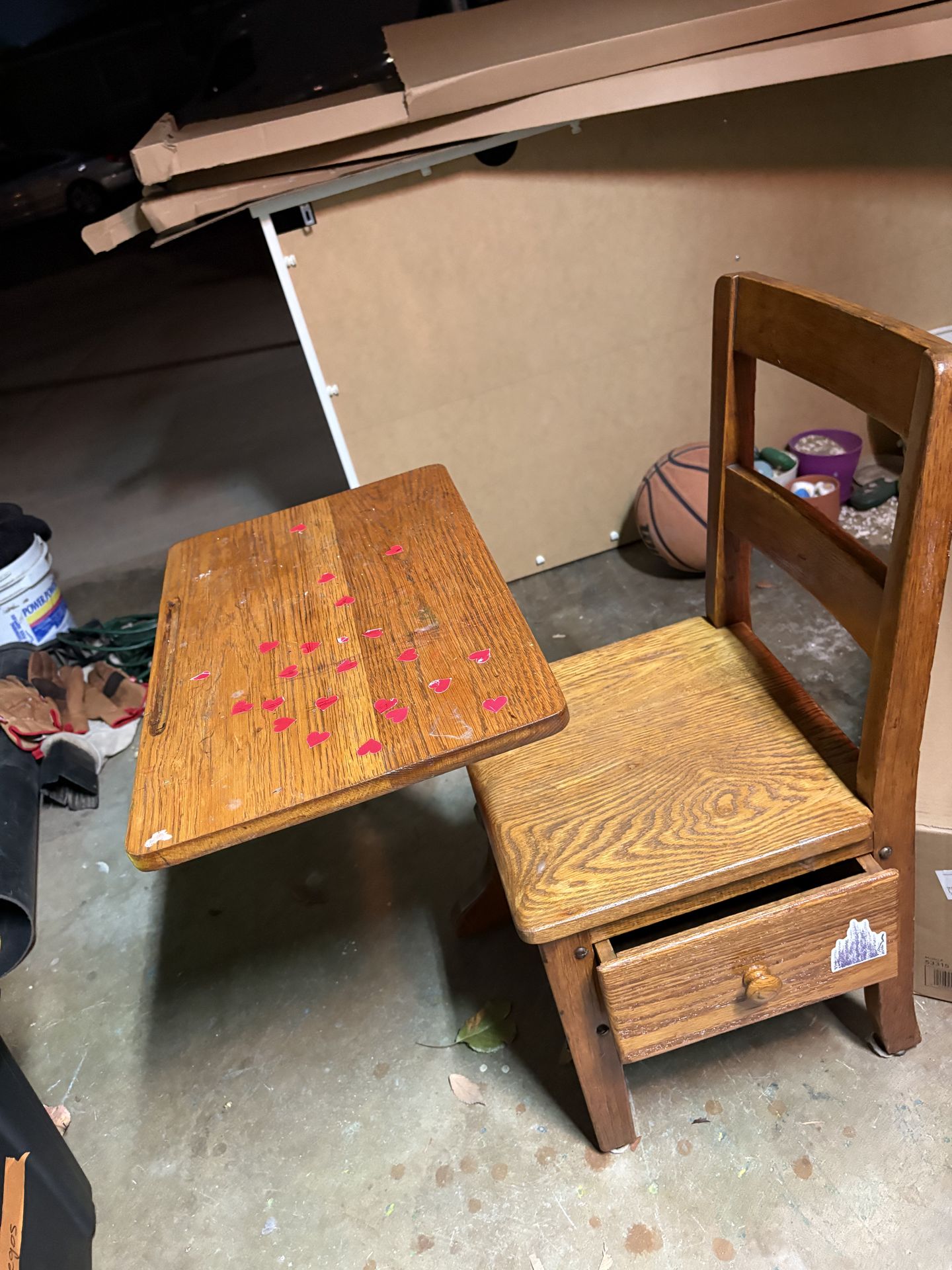 Small wooden desk with drawer. Needs to be refinished, but made of solid wood and sturdy. Perfect for toddlers to kinder size kiddo.