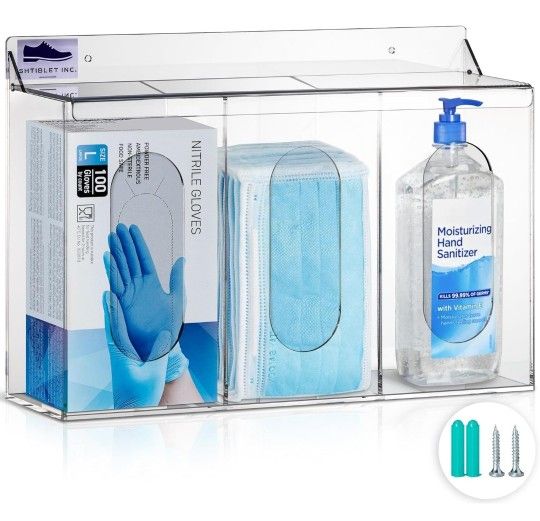 Selling Brand New in the box Clear Acrylic Medical Organizer Hygiene Station with Lid - 3 Compartment Glove Dispenser Wall Mount Container for Face Masks, Hairnet, Glovebox - Hair Net Dispenser The Shtiblet LLC triple sanitation station wall mount with a lid is the ideal solution for businesses and organizations prioritizing hygiene, organization, and efficiency in their daily operations. It offers a comprehensive and convenient way to manage essential supplies and keep your environment clean and safe. Perfect to keep such personal protective equipment (PPE) and hygiene supplies as gloves, individual face masks, hairnets, plastic bags, beard covers, and more Enhanced Organization: Keeping your workplace organized has always been challenging. With this glove box holder wall mount, you can easily see when supplies need replenishing, reducing the risk of running out of critical items when you need them most. Lid for Added Protection: The included lid serves as an additional layer of protection, safeguarding the stored items from dust or moisture. This feature is especially crucial for maintaining the integrity of PPE and ensuring items are ready for use at any moment. Professional Appearance: The sleek and transparent design of the Shtiblet triple hygiene dispenser station with a lid complements any workspace and gives your hygiene station a professional and organized look. Promote Safety and Compliance: By having a well-organized and easily accessible hygiene station, you contribute to a safer and more compliant workplace, promoting best hygiene practices. User-Friendly: This glove box dispenser wall mount is easy to use and refill. It simplifies accessing essential PPE and hygiene items, making it a user-friendly addition to any environment, whether for office staff, customers, or guests. Asking $35