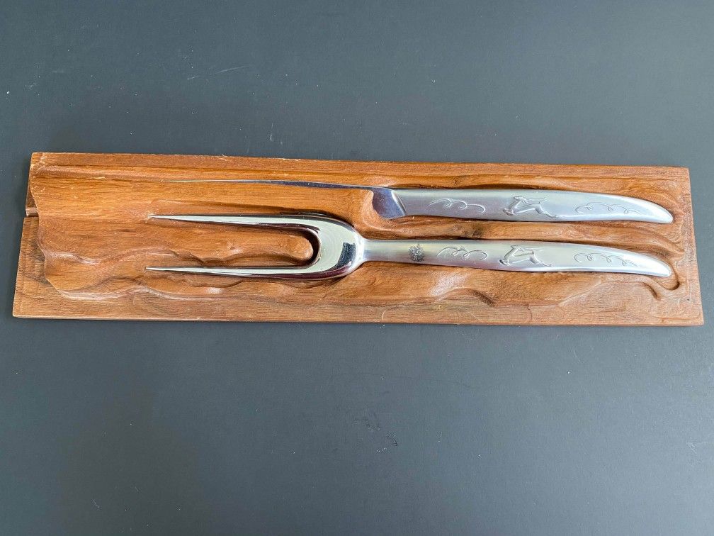 Latama ITALY 2-piece Carving Set in decorative hardwood. Good lightly used condition with one raised spot on the fork handle light contact marks. The wood measures appx 4.5" x 17". The long thin knife measures appx 15.75" and the fork measures appx 11.5 raised design reindeer, antelope. Receive a free Christmas Advent craft with purchase.