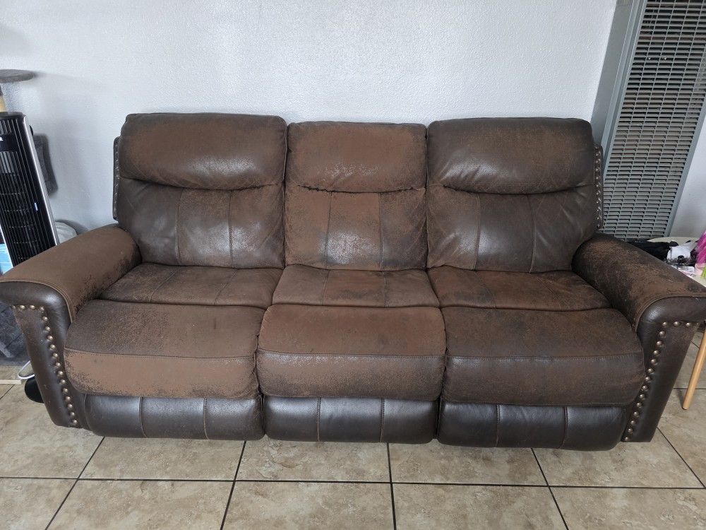 Hello I have a dark brown reclining couch set. All recliners are in good working condition. This couch is not electric. All recliners work manually which limits the possibilities of them breaking down to easy. Couch has storage space and also has two cup holders. It is faux leather but most of it has peeled. Once upholstered it will look like new!. Cushion still feels great. FREE