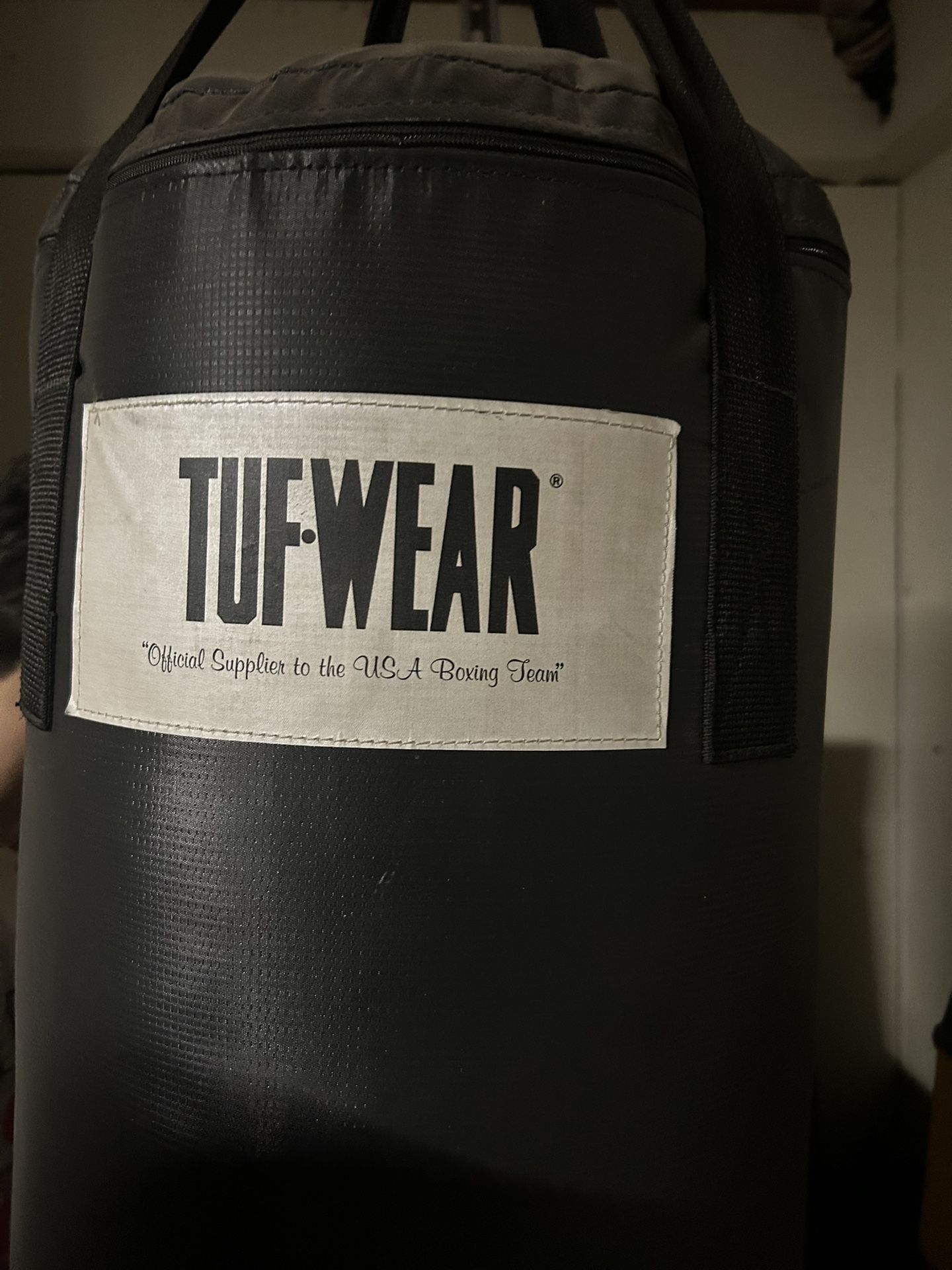 TUF WEAR heavy punching bag in good condition. Made with durable material and built to withstand intense training sessions. Features reinforced straps for secure hanging and a zippered top. Great for boxing, MMA, fitness training, or home gym use. Official supplier to the USA Boxing Team. Shows normal signs of use but no major damage or tears.