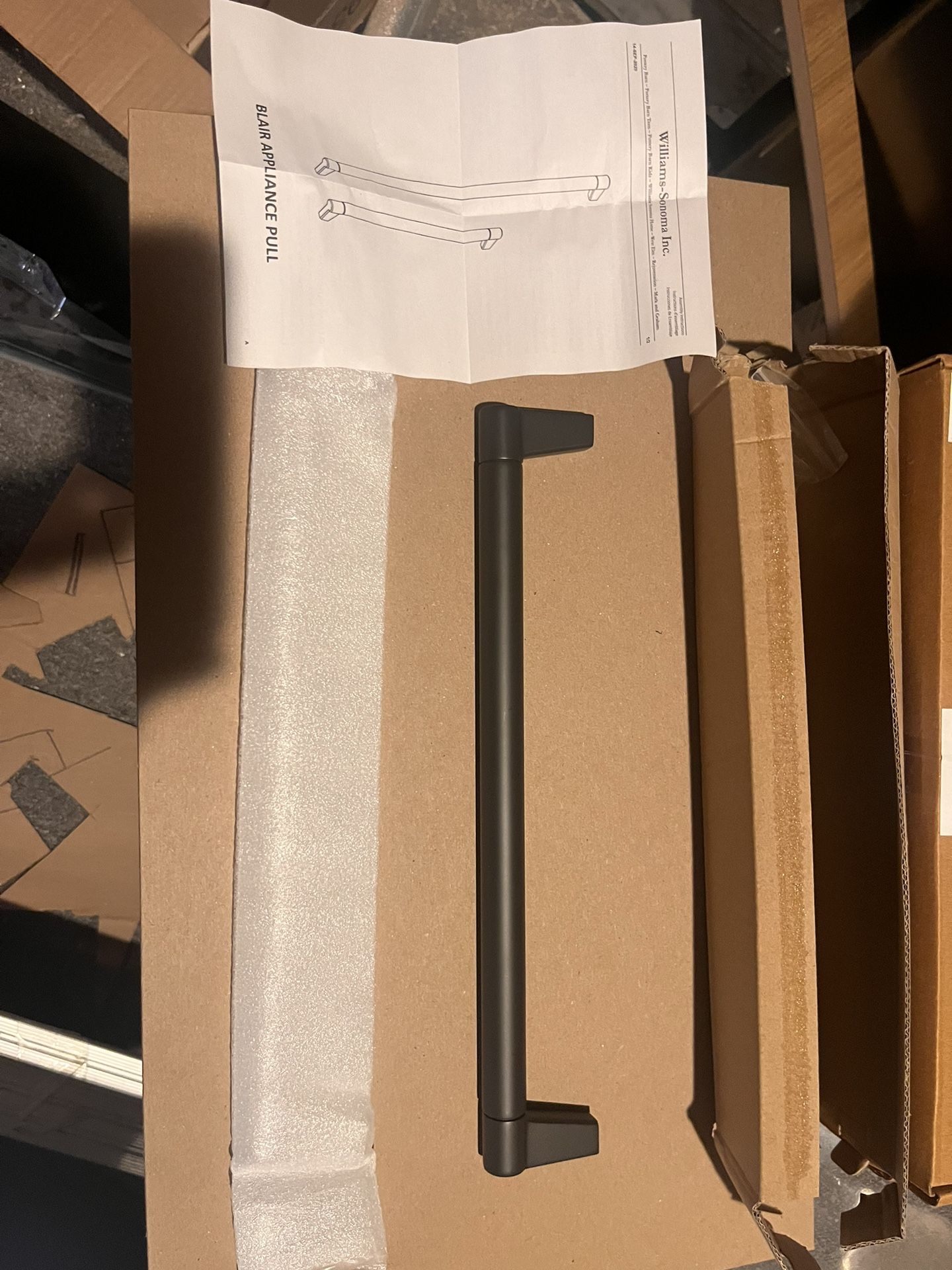 12,5 inch long oil-rubbed bronze (reads matte brownish black) appliance pull from Rejuvenation. Open box. Never used, all parts included.