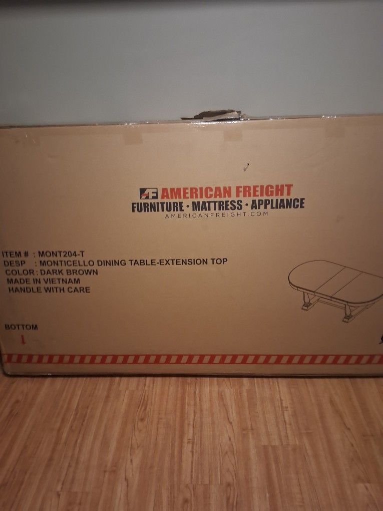 Monticello Dining Table with Extention Top for sale. It is bark brown in color. BRAND NEW STILL IN BOX. Delivery can be arranged.