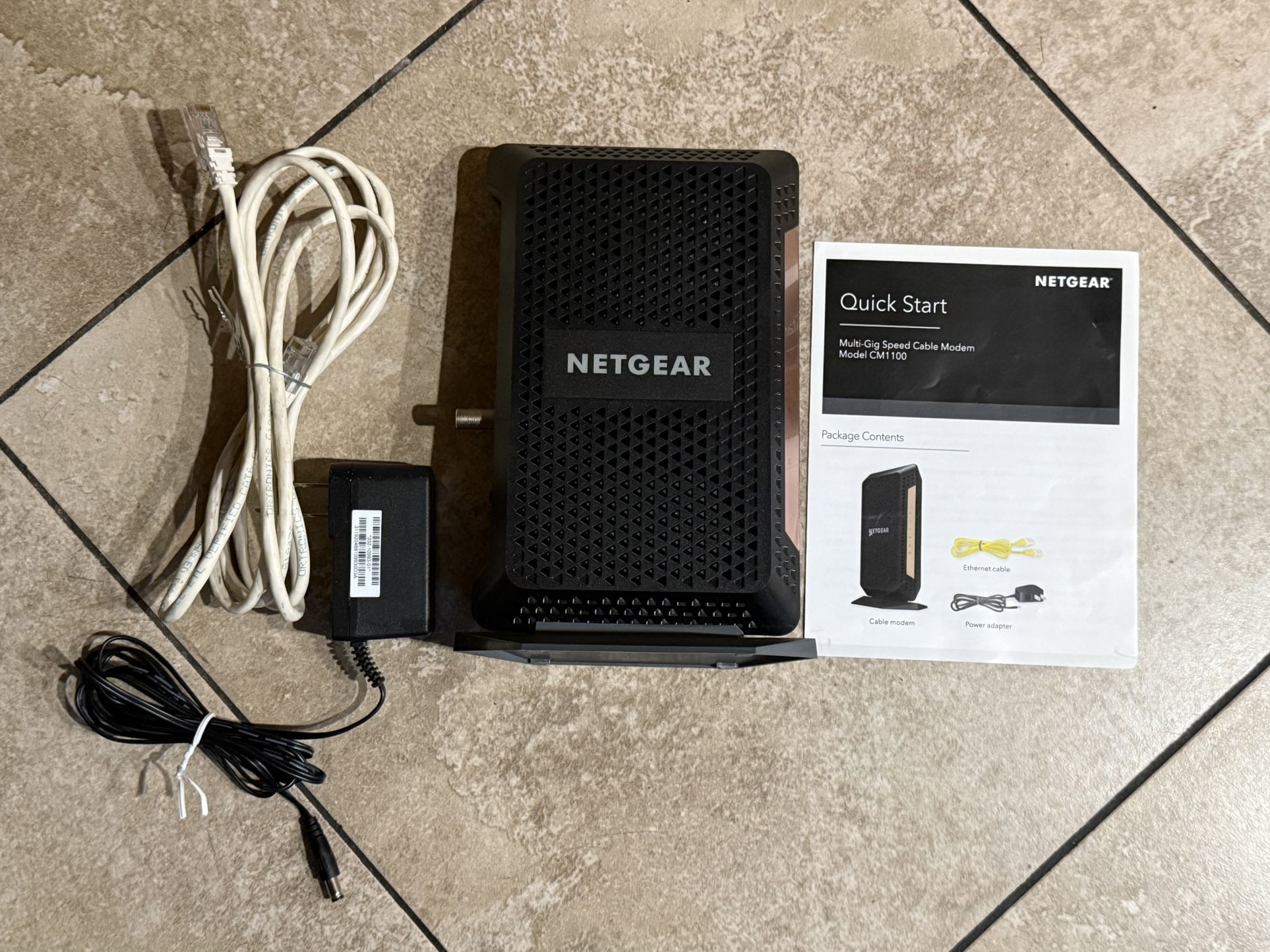 Fast Netgear CM1100 Multi-Gig cable modem. Has power adapter and Ethernet cable. Good for high-speed internet.