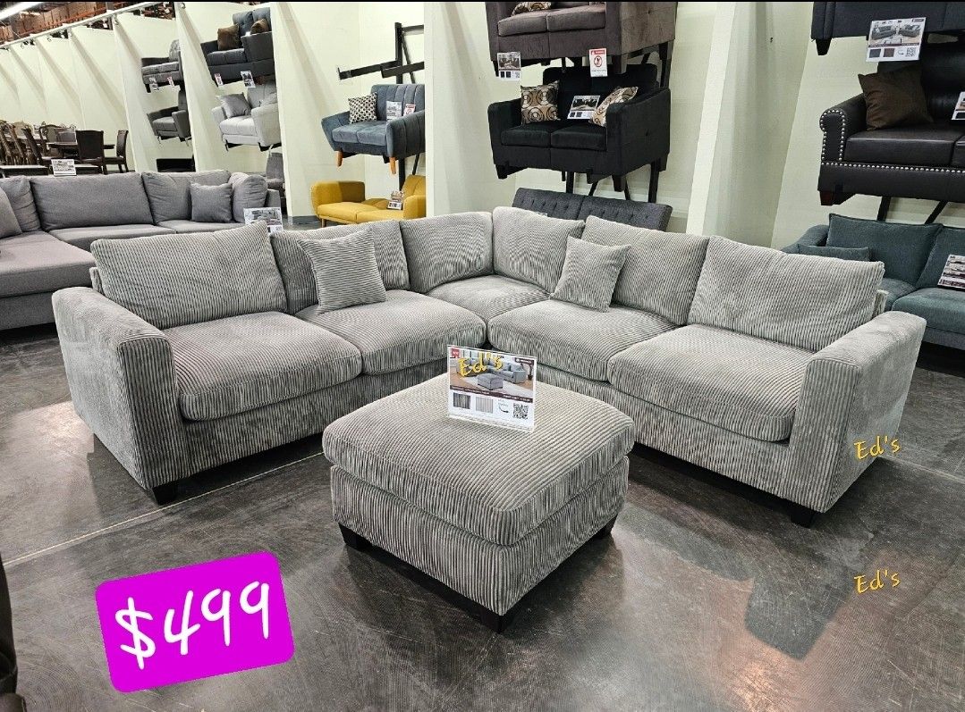 BRAND NEW 4PCS SECTIONAL SOFA SET WITH OTTOMAN AND ACCENT PILLOW INCLUDED ALL NEW IN BOX ASSEMBLE REQUIRED AVAILABLE IN GRAY OR IVORY CORDUROY