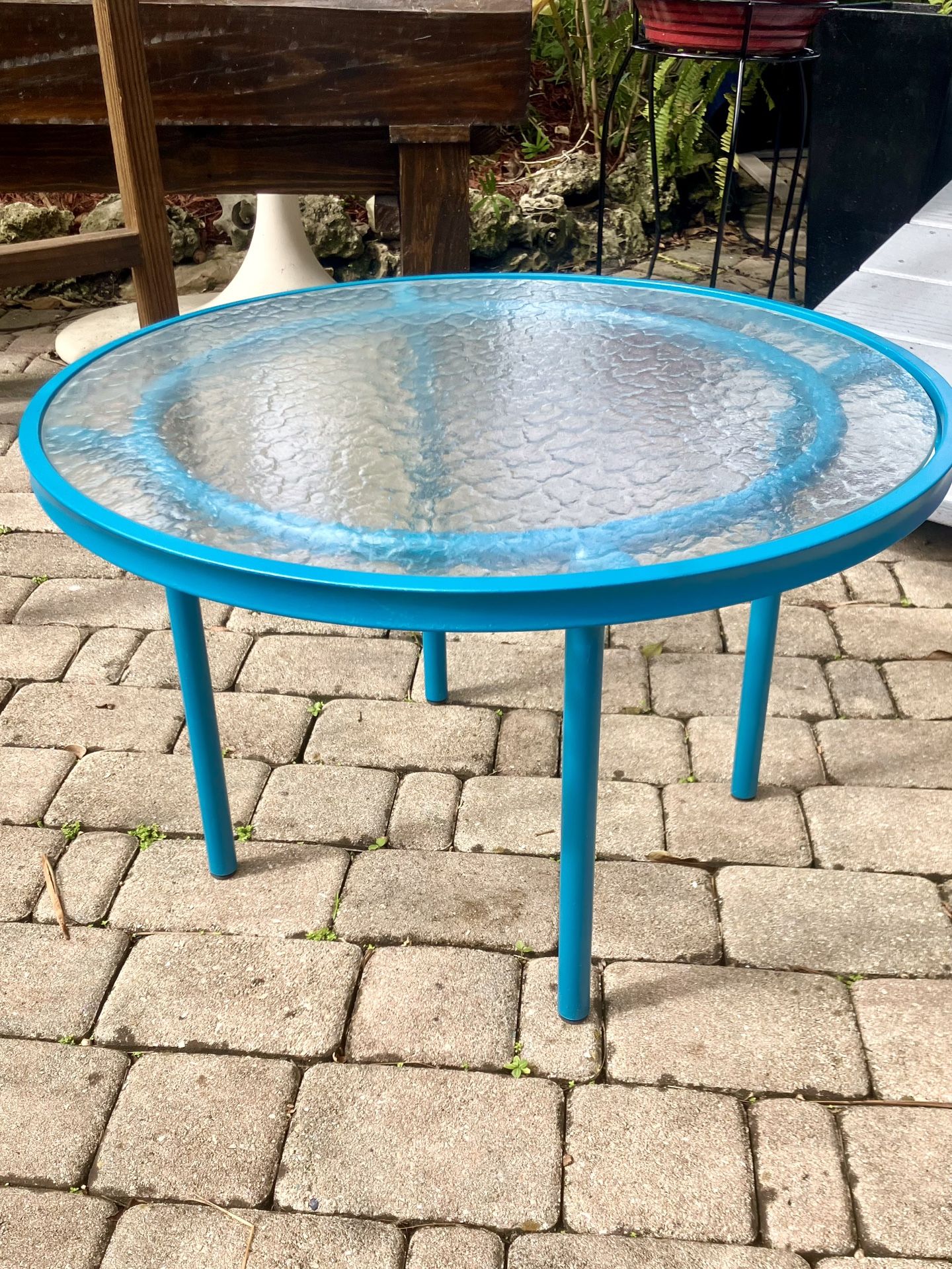 Selling Outdoor Aluminum Glass Top Side Table: 24”W x 15”H. Recently Painted. New rubber Feet. Good Condition. Firm on price.