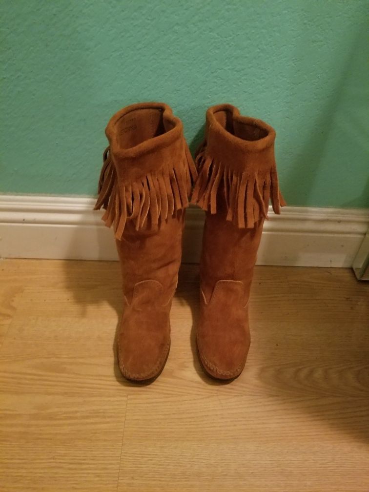 Minnetonka Brown Sueade Boots..Size 5 womens..really cute with Fringe..Like new!
