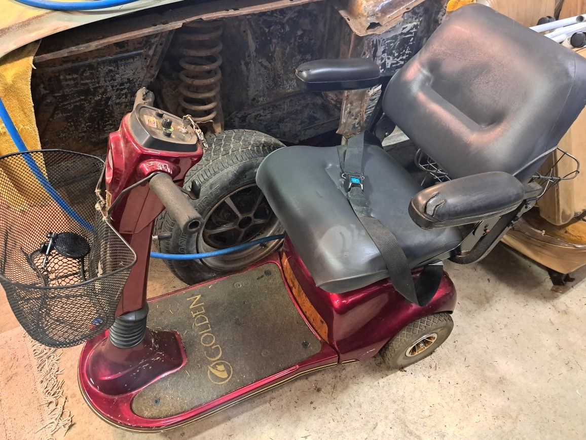 Golden Companion II. 3 wheeled, powered mobility scooter. Works fine. Has charging cord, front and rear baskets, headlight and taillights. Does have wear on armrests and right grip. Potential delivery available.
