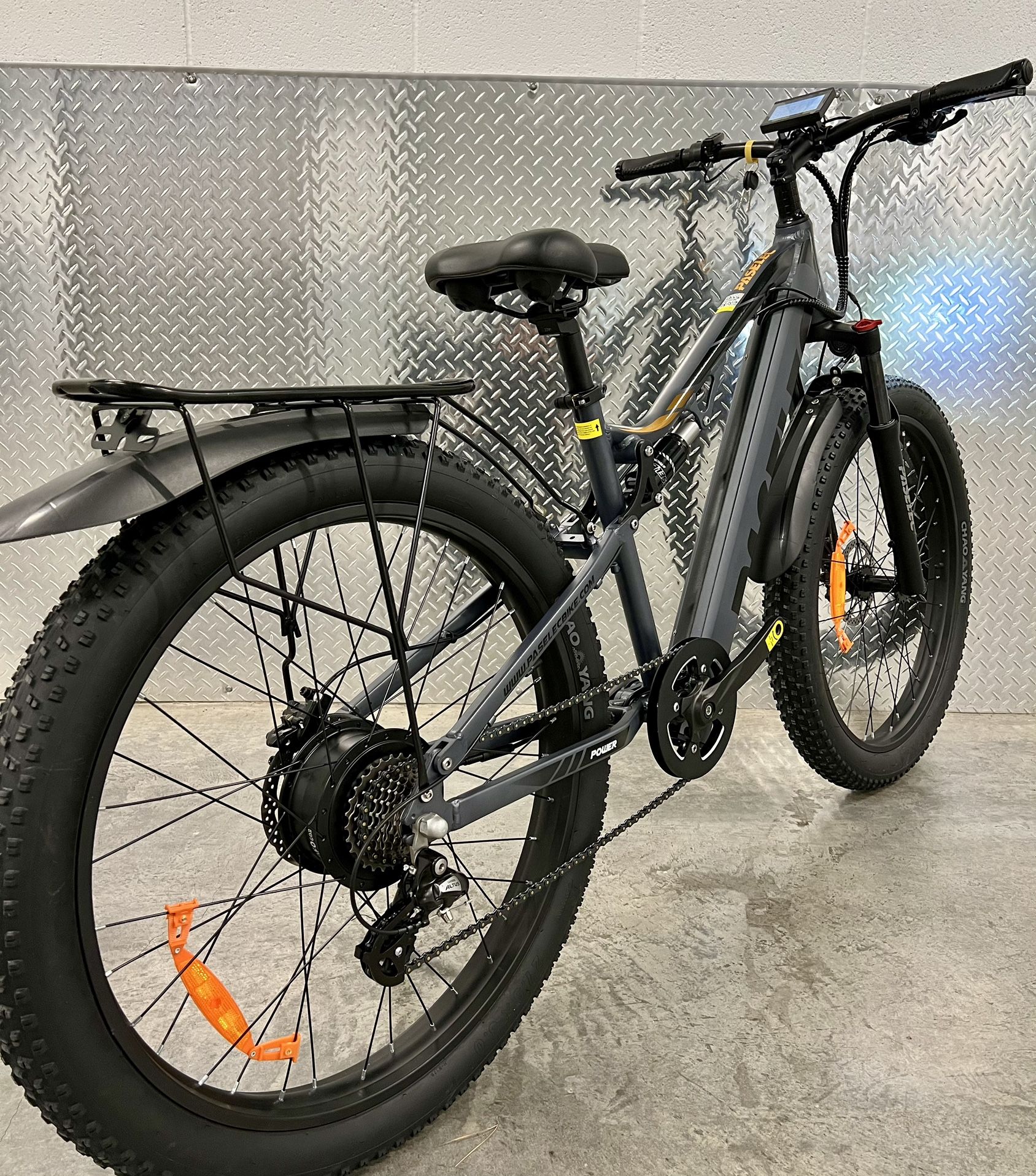 This bike is “Ready for TRUE adventure“ Electric Endurance Mountain e-bike 500/750Watt Electric Rear Hub Bafang Motor Thumb throttle / or Pedal Assist 16ah Battery / 48V Removable 27.5x3.0 Tire (A bit wider than standard mtb tires for more comfortable and handling) 5’4-6’6 Rider 28mph 5 Speed Electric Pedal Assist 8 Speed Shimano Altus Derailleur (Paddle Shift) Color Screen Rear rack