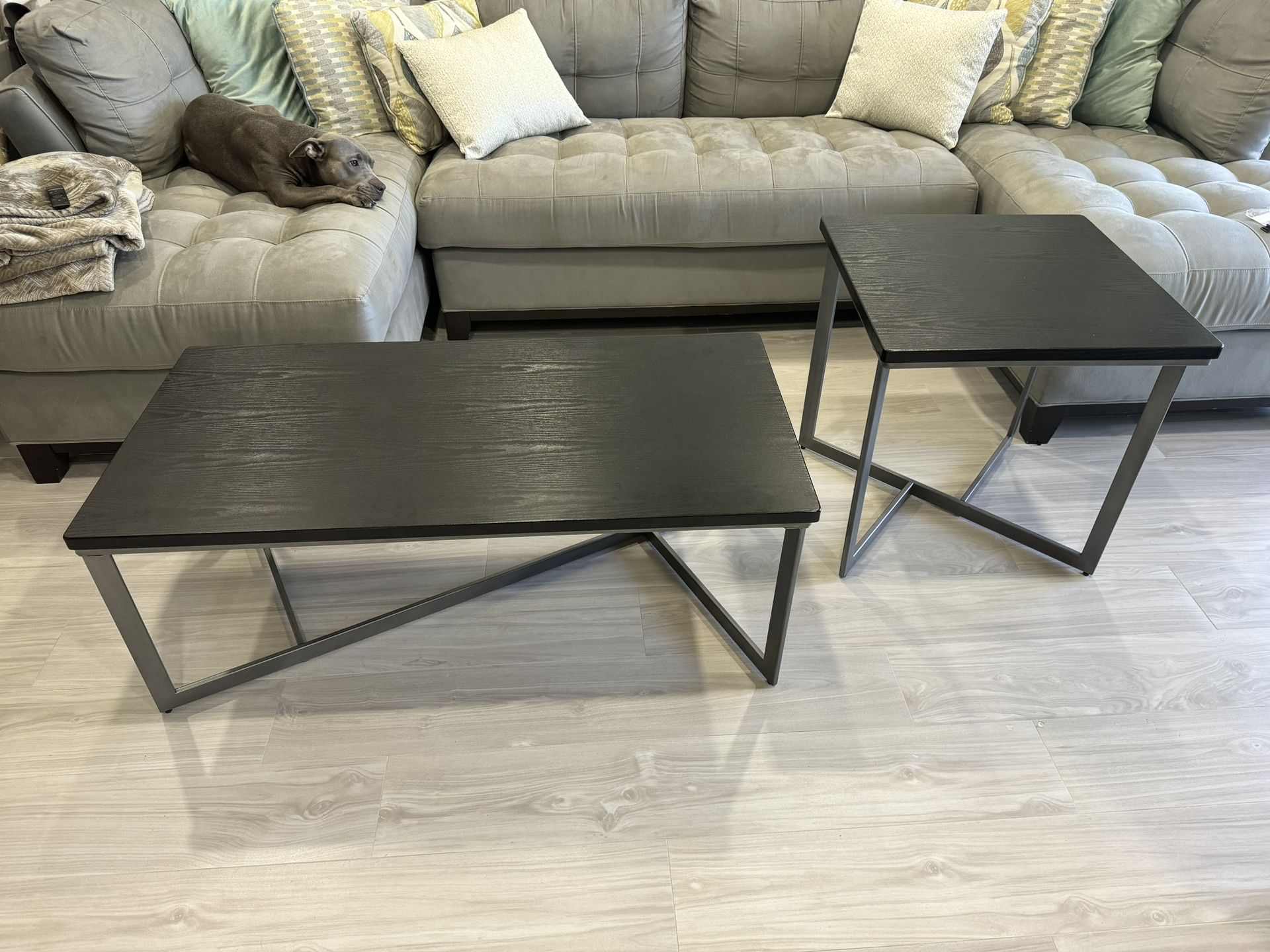 Black wood top with chrome finish base end table and Coffee table Dimensions cocktail table: 48”l x 24”w x 18”h End table: 24”l x 24”w x 24”h