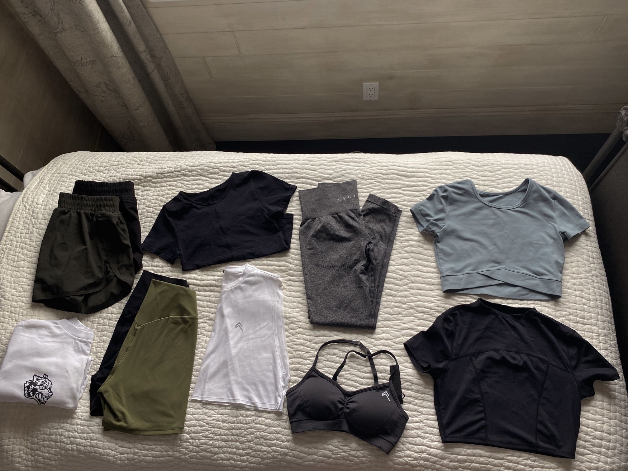 SIZING AND PRICING DOWN BELOW… ‼️‼️ Darc Sport white tee size medium $30 blue/pink/purple leggings pile medium $10 each Bras $6 each medium (all three for $15) Lululemon bra $15 Black medium nvgtn $40 Blue crop top $30 small/medium Black crop top $30 Flowy shorts $20 each medium Tight Shorts (green and black) $20 each medium Oner active bra coal size medium $30 Black full length top $30 gym shark aybl buff bunny youngla dyfne
