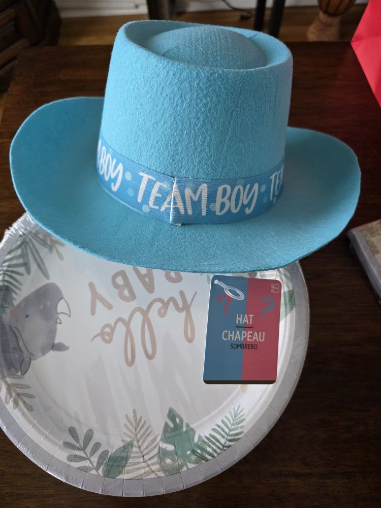 Baby came early and never used. All new & sealed. 3 packs - Beverage Napkins 3 - Tablecovers 6 packs - Plates 2 - Soft Jungle Hello Baby Tinsel Burst Weighted Centerpiece 1 - Baby Blue, felt cowgirl hat - Boy 50 - colorful gift bags