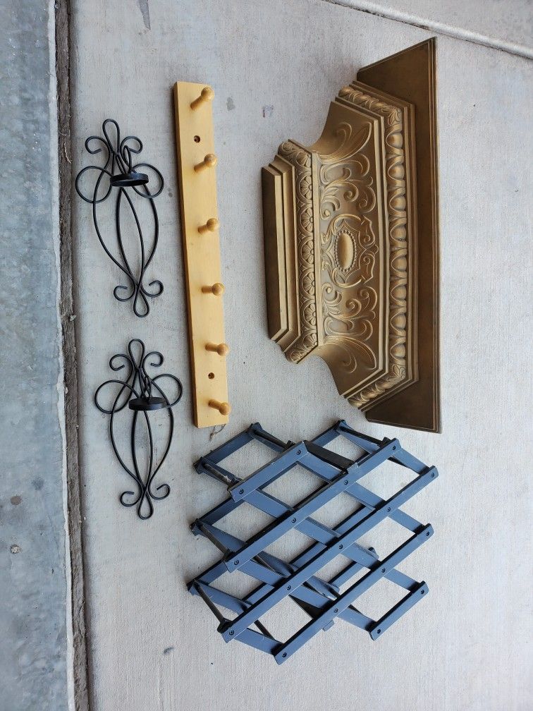 Wall shelf, coat hanging rack, wine rack, pair of wall adornments.