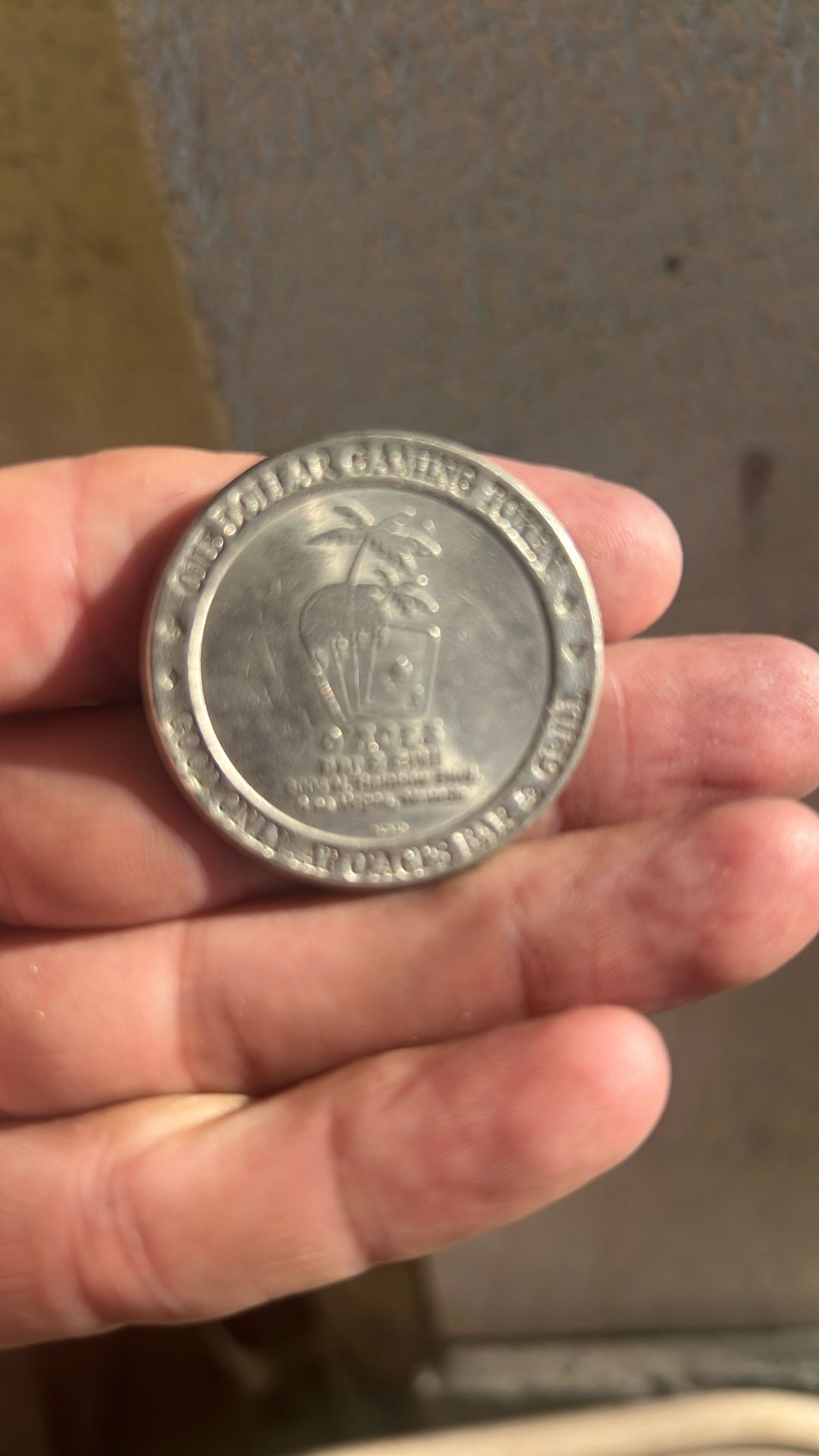 The image displays a "One Dollar Gaming Token" with the text "FOR SLOT PLAY ONLY" and the address "4601 W. Charlestony Blvd. Las Vegas, Nevada" LIKE 1000 MAKE AN OFFER