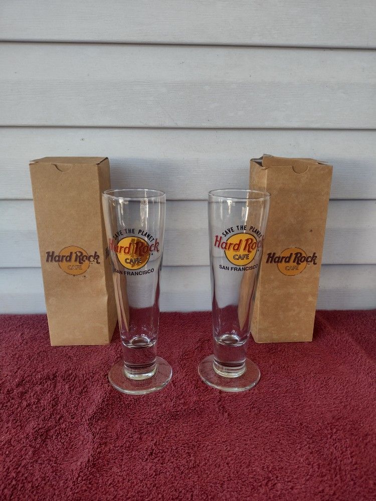 2 Hard Rock Cafe Tall Footed Glass San Francisco Save The Planet 9" 1/2" tall. Like New condition, 1 has a little discoloration on the logo. Comes in original box. See all pictures for more details.