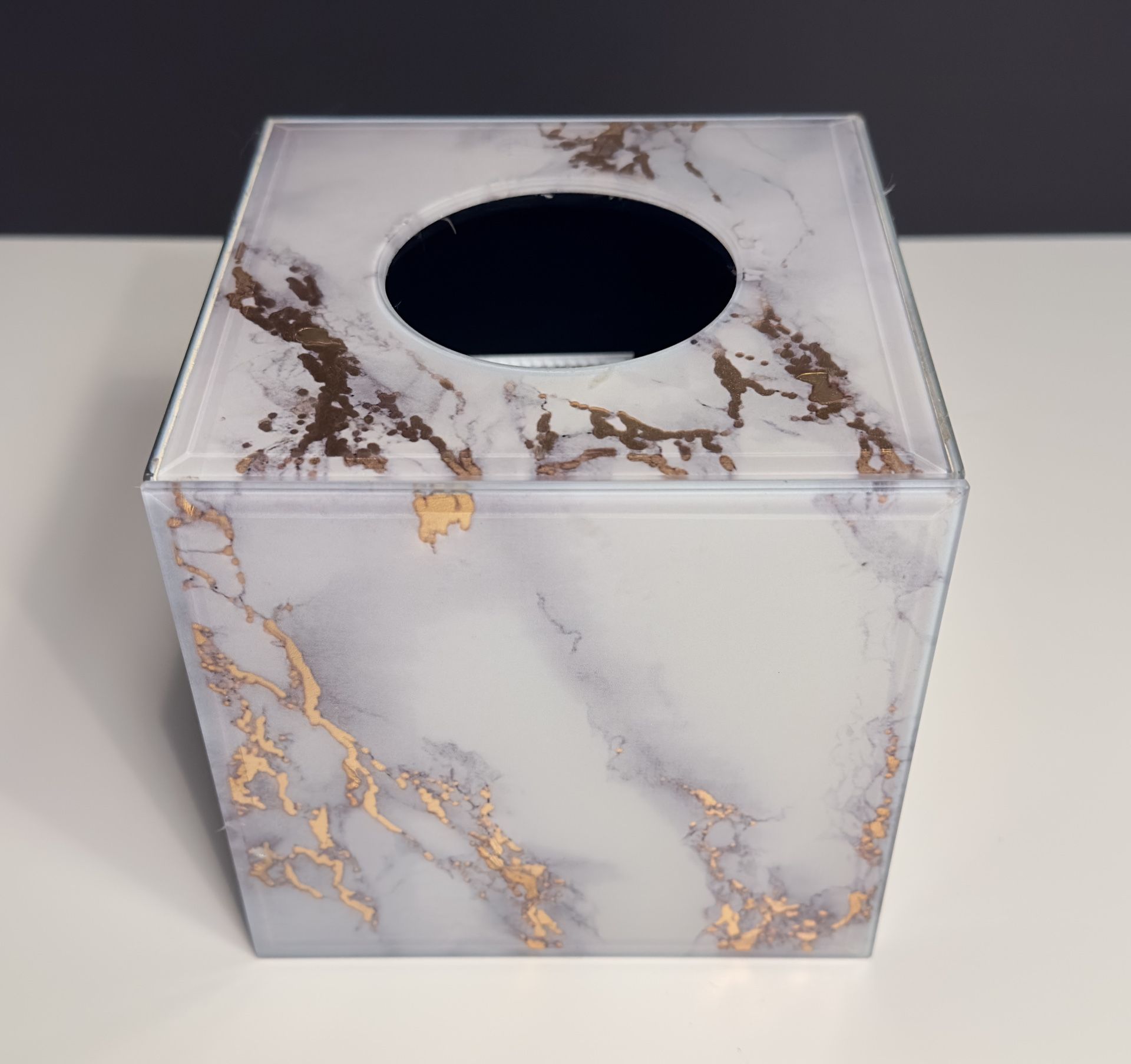 Elegant Kassatex tissue box cover. White and gray marble pattern with cool gold veins. Clear acrylic material, looks super nice on a counter or a table..