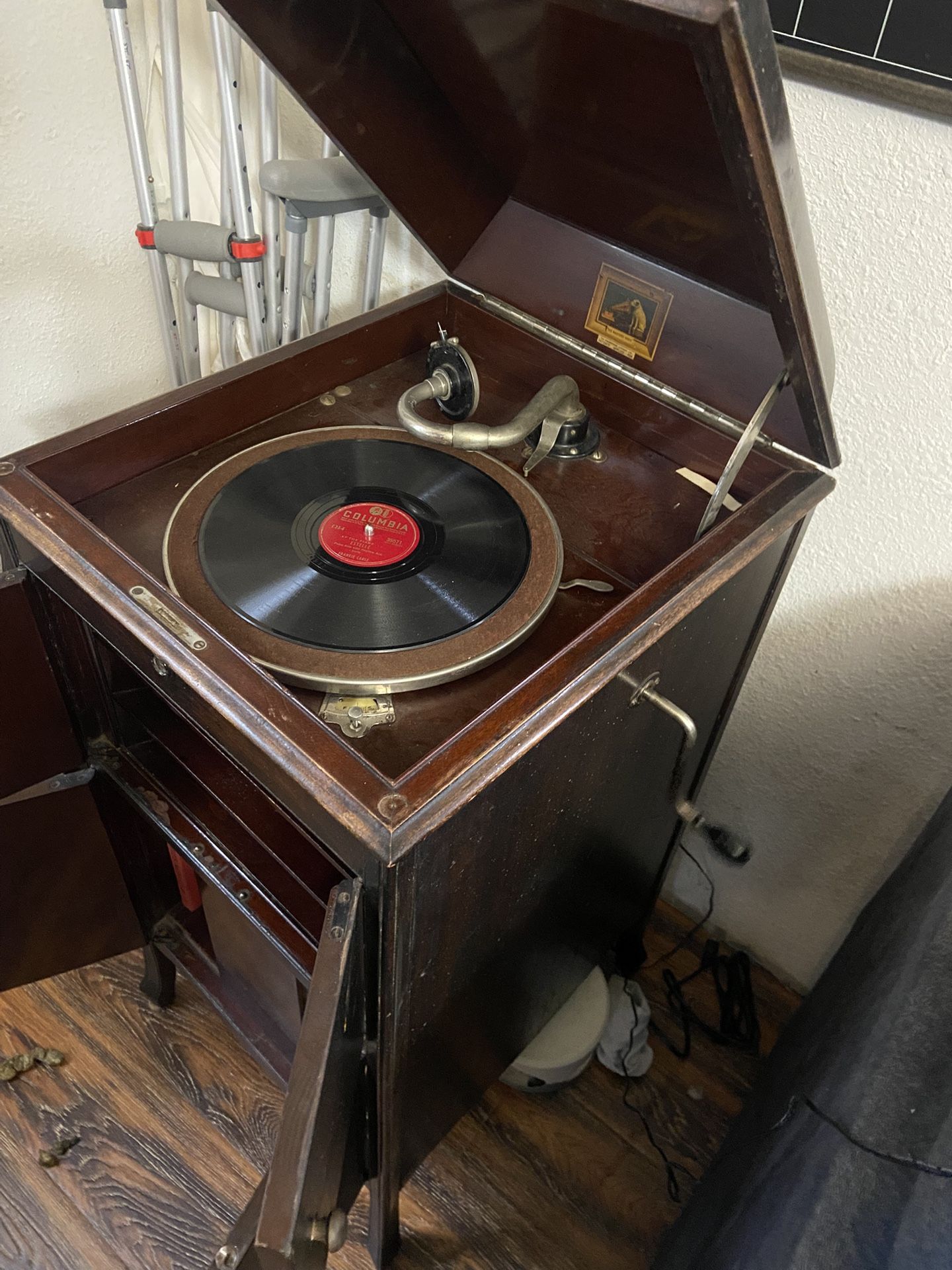 This is in excellent condition will need to be polished again and cleaned with warm water. What it is A mechanical gramophone / phonograph cabinet, likely from the 1910s–1920s. It plays 78 RPM shellac records, not vinyl LPs. It does not use electricity — it’s powered by a hand-cranked spring motor (the crank is on the side). The crank handle on the right The metal tonearm and needle → purely mechanical The “His Master’s Voice” (Nipper the dog) label inside the lid → iconic trademark used by Victor / HMV / affiliated companies. Internal horn → the sound travels from the needle down into a horn hidden inside the cabinet. How it works (simple version) You wind the crank to tighten the spring motor. Put a steel needle in the tonearm. Place a 78 RPM record on the platter. Start the motor. The needle vibrates in the groove → vibrations travel through the arm → amplified by the internal horn → sound comes out the cabinet.