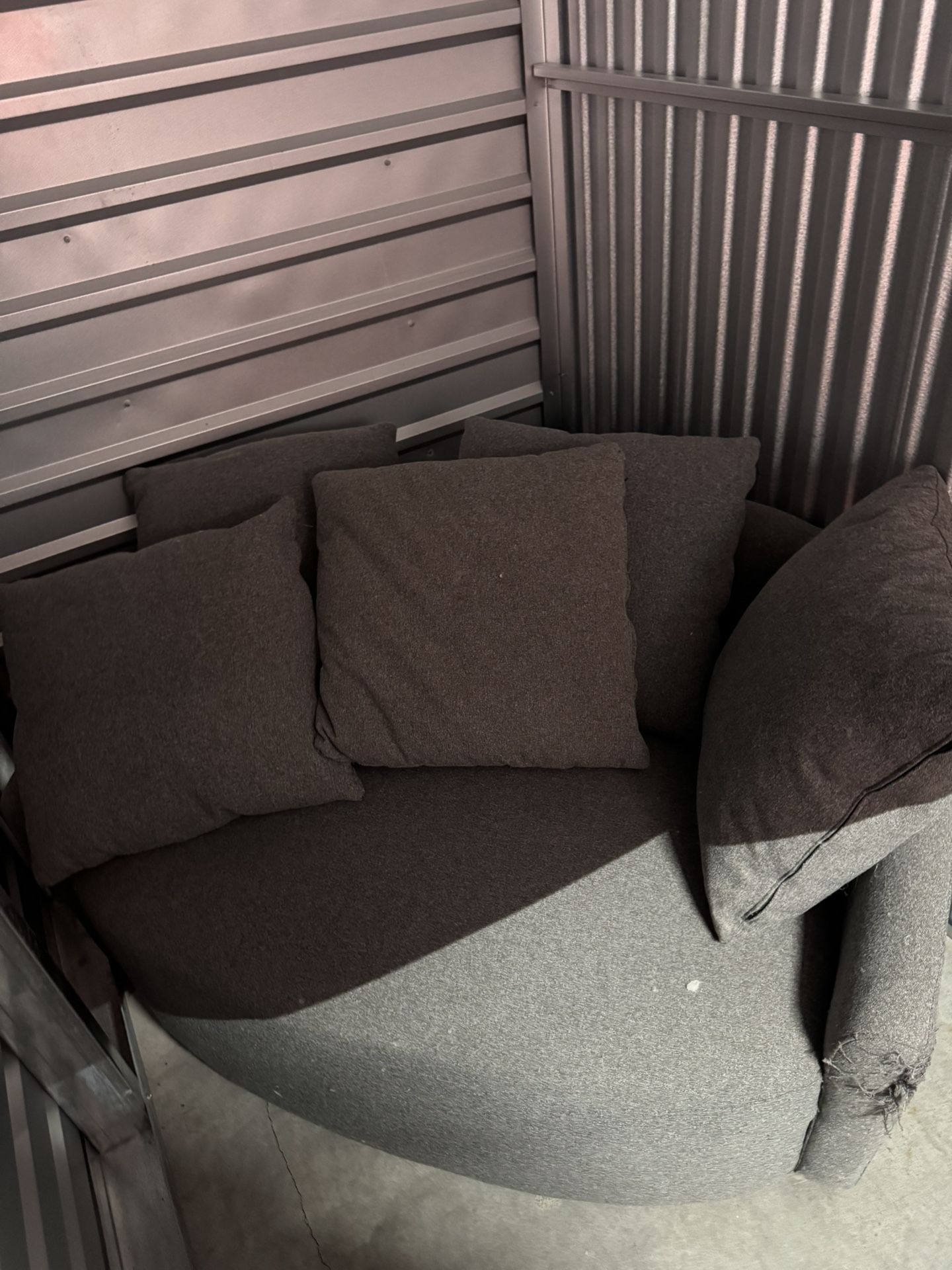 It’s a small couch that rotates on the base. Shaped like a half moon. Has some damage on the front right side of it from cats clawing it. It’s roughly 5 ft wide and 3-1/2 ft deep. Currently in a storage unit and might need some vacuuming across it. Comes with 5 pillows as well.