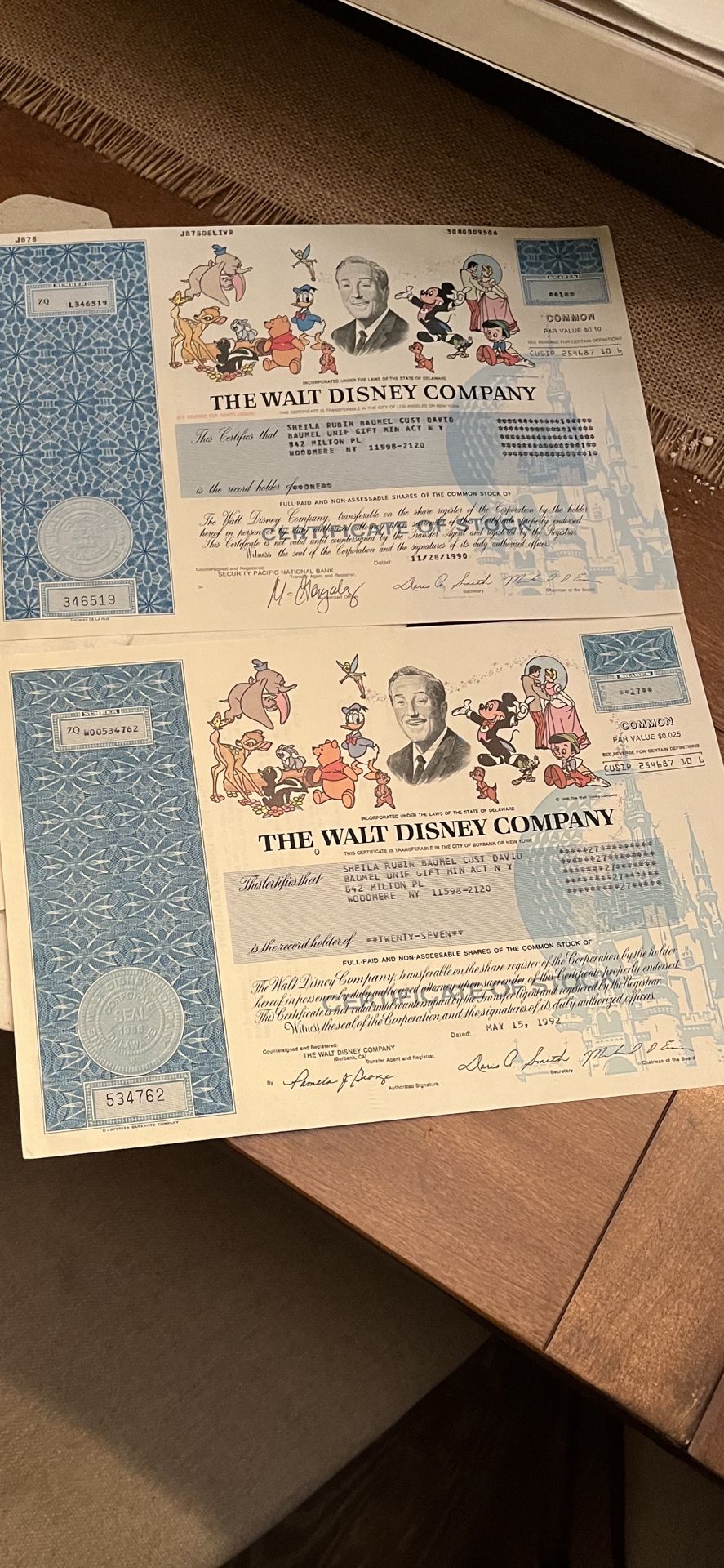 The Walt Disney Company certificate of stocks