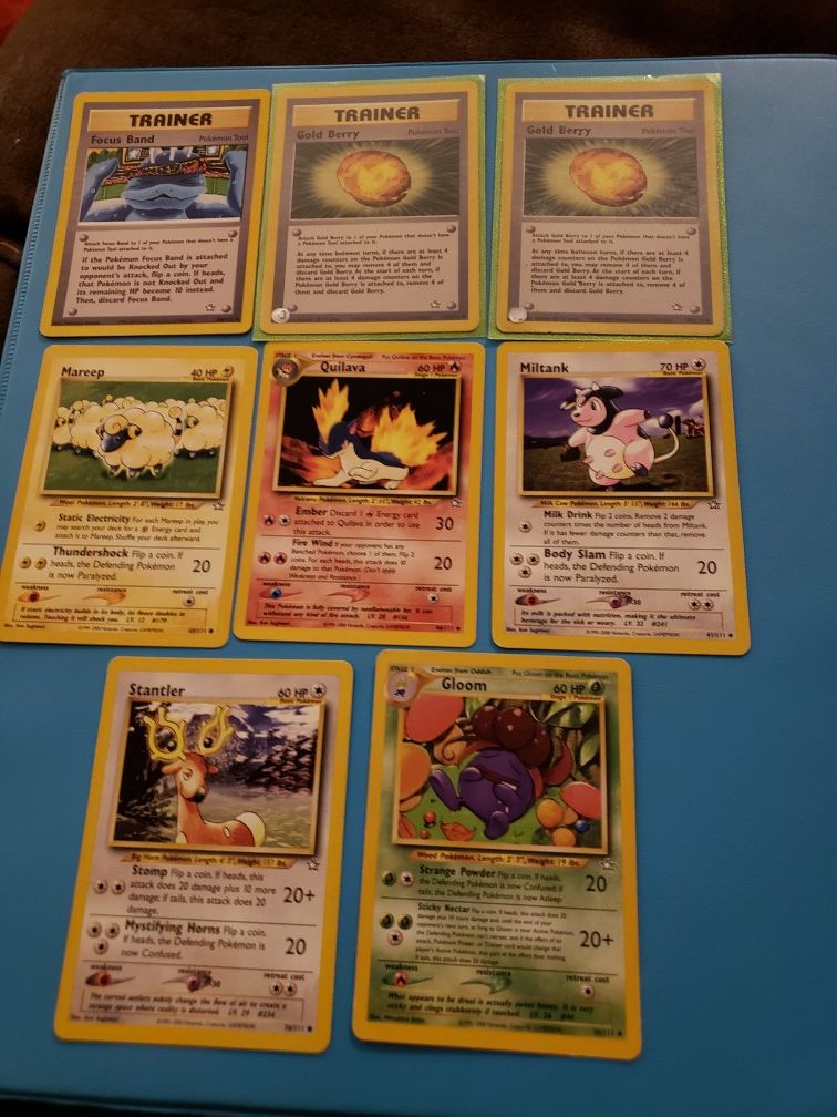 This is a lot of 8 neo genesis non holo cards that come in really nice condition, gloom, focus band trainer, quilava, gloom, gold berry and others.