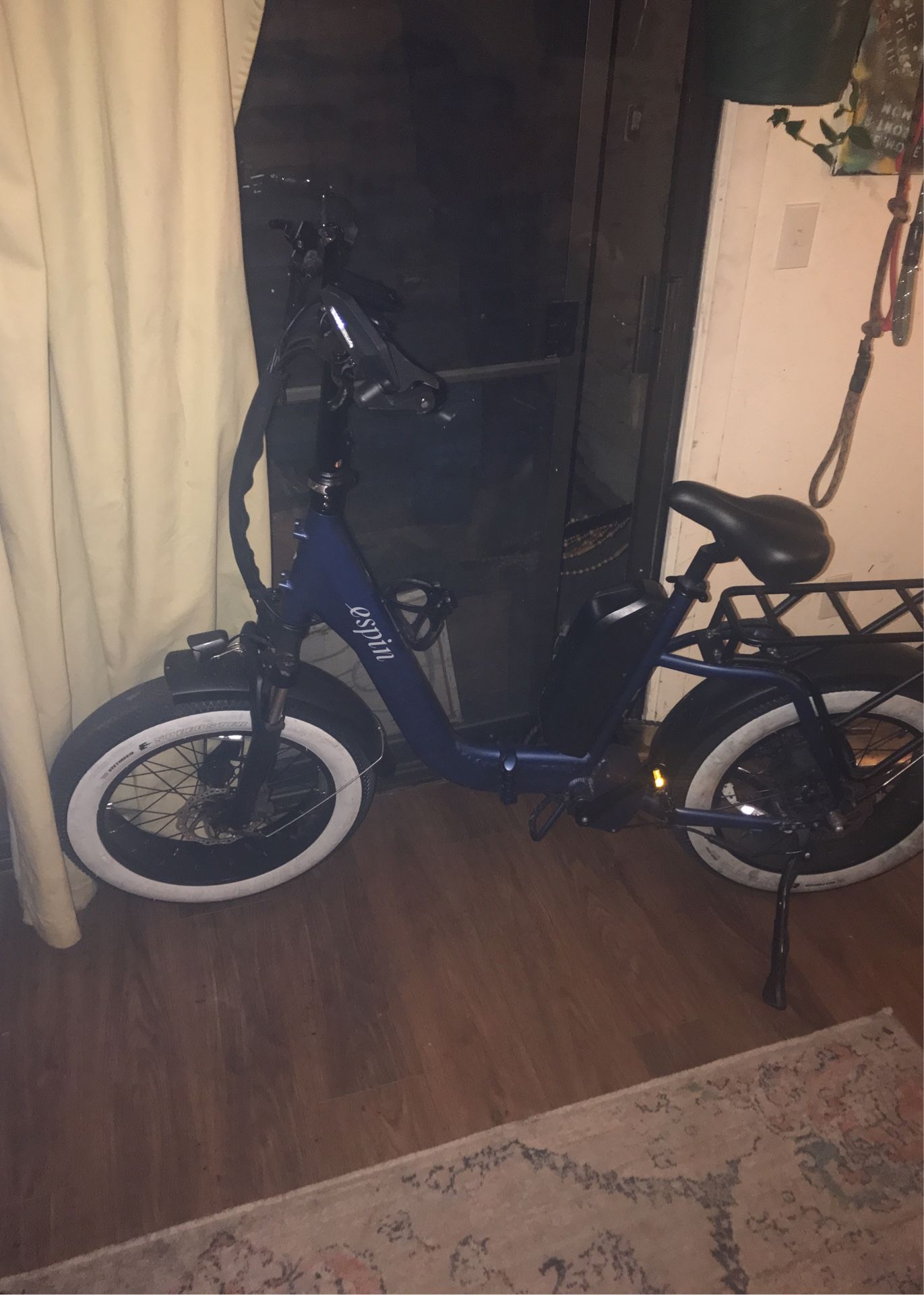 Espin Folding E-bike Fat tire 25 mph 64. Miles on it Great condition no issues rides great can go faster if you get smaller tires for it you can fold it and put in your trunk easily Comes with extra battery and charger Each battery goes for 300-500$ retail for this bike and you get 2 of them for the low Bike retail price 1700$ My price for everything 1100$ obo