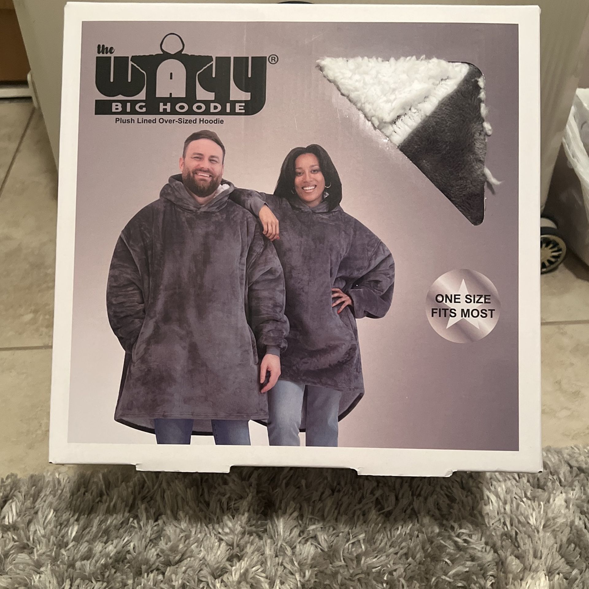 New still in box. High quality - oversized. One size fits most Long set-in sleeves, ribbed knit cuffs Functional pockets Plush lined - sherpa fleece lined inner hoodie This is the only layer you’ll need to keep warm all day and night.