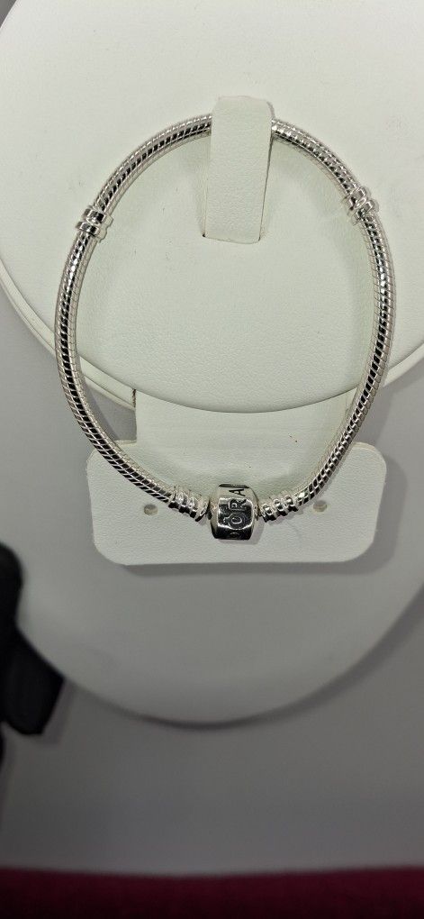 Crafted in sleek sterling silver, this snake chain bracelet features Pandora's iconic barrel clasp for a secure fit while the innovative threading system makes it easy to screw charms onto your bracelet. (NO BOX)