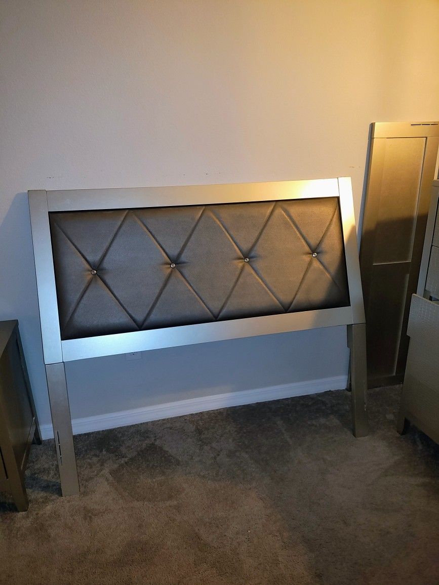 Ashley Olivet silver upholstered bed frame with rails, (2) Night stands, 5- Drawers Chest. Normal wear, some minor scuffs, nails polish on top of the nightstands but besides that, it's still in fair condition. Comes from a smoke and pet free home.