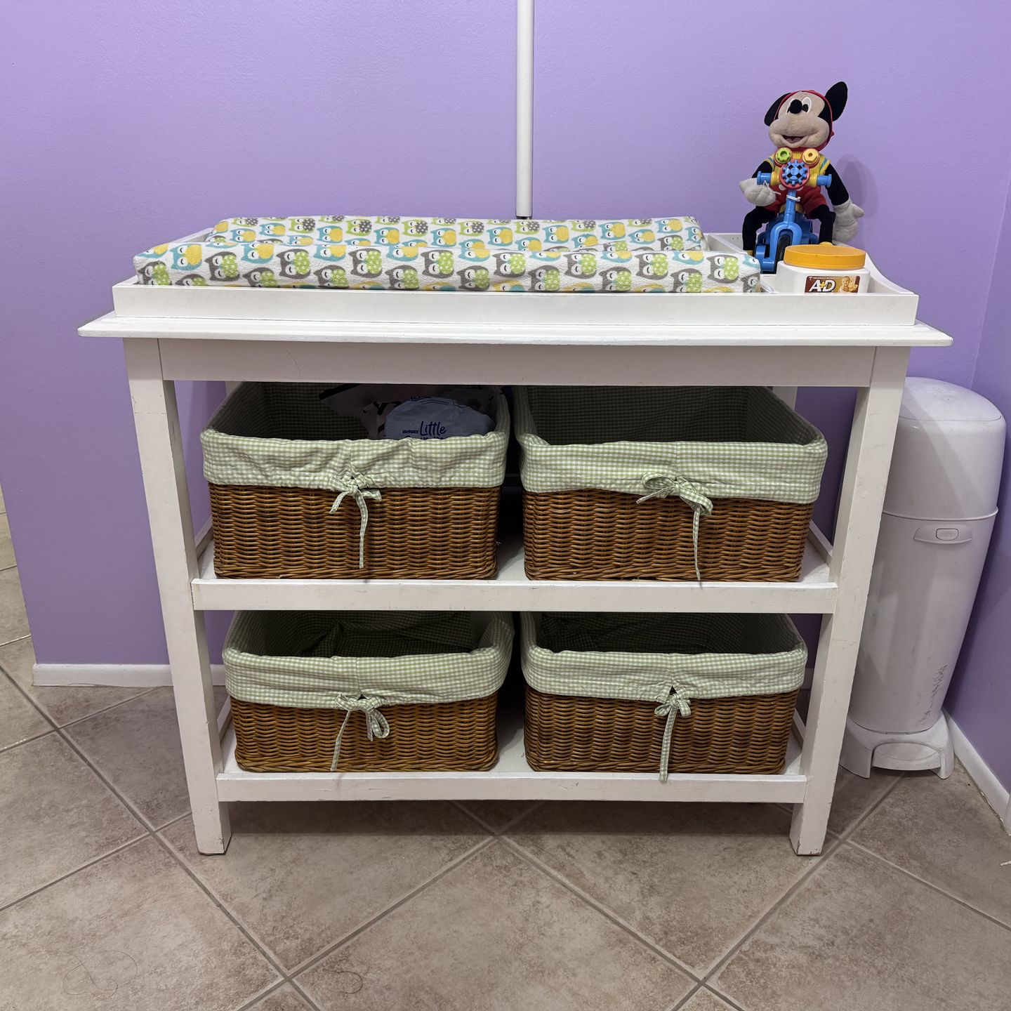 Sturdy changing table for baby/infant. Comes with baskets and changing pad. Has a little bit of paint chips shown in last two photos. Pick up only. A&D and Mickey not included.