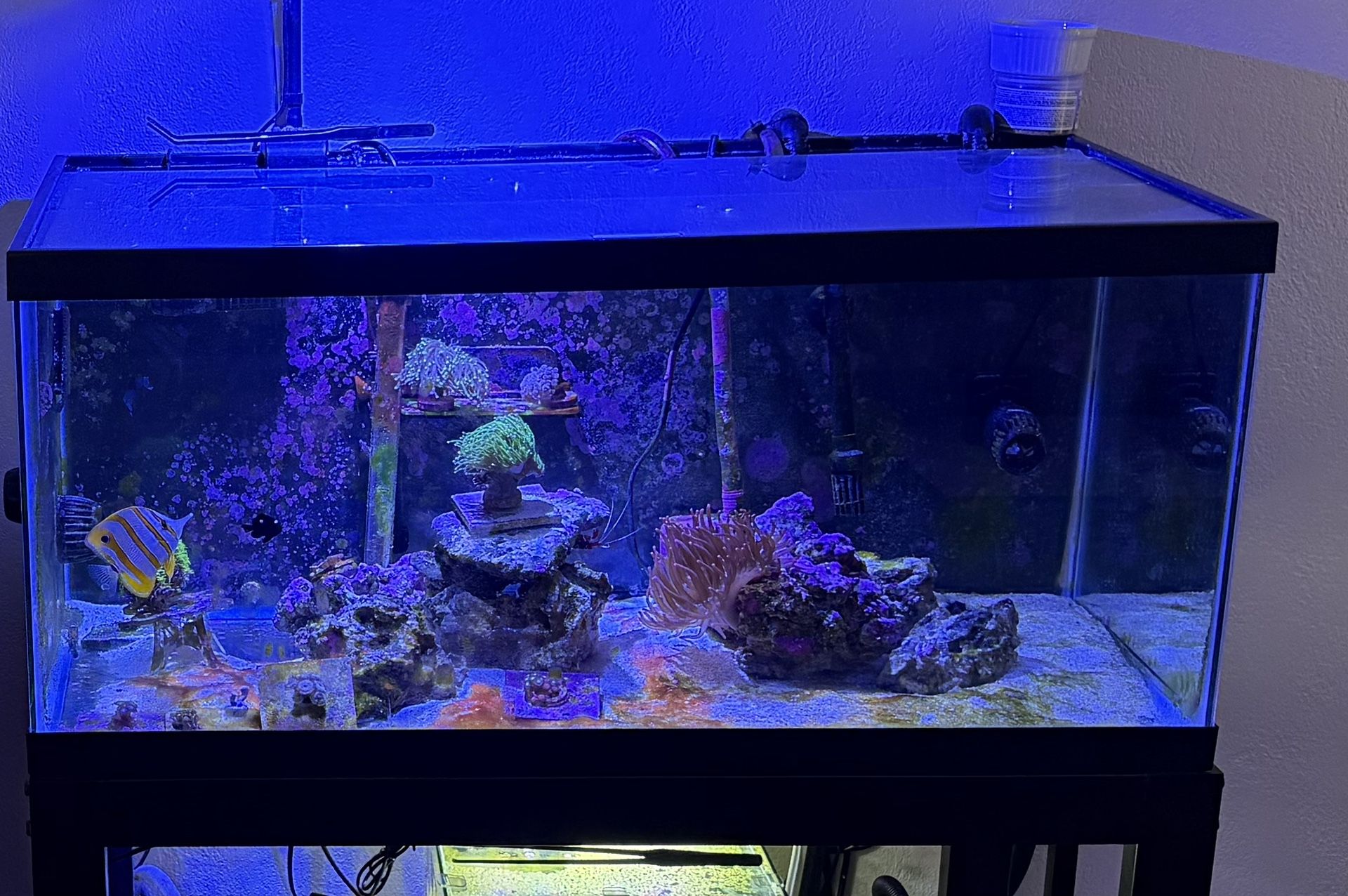40 gallon fish tank & aluminum black stand. Had a 50 gallon chiller but that’s sold separately