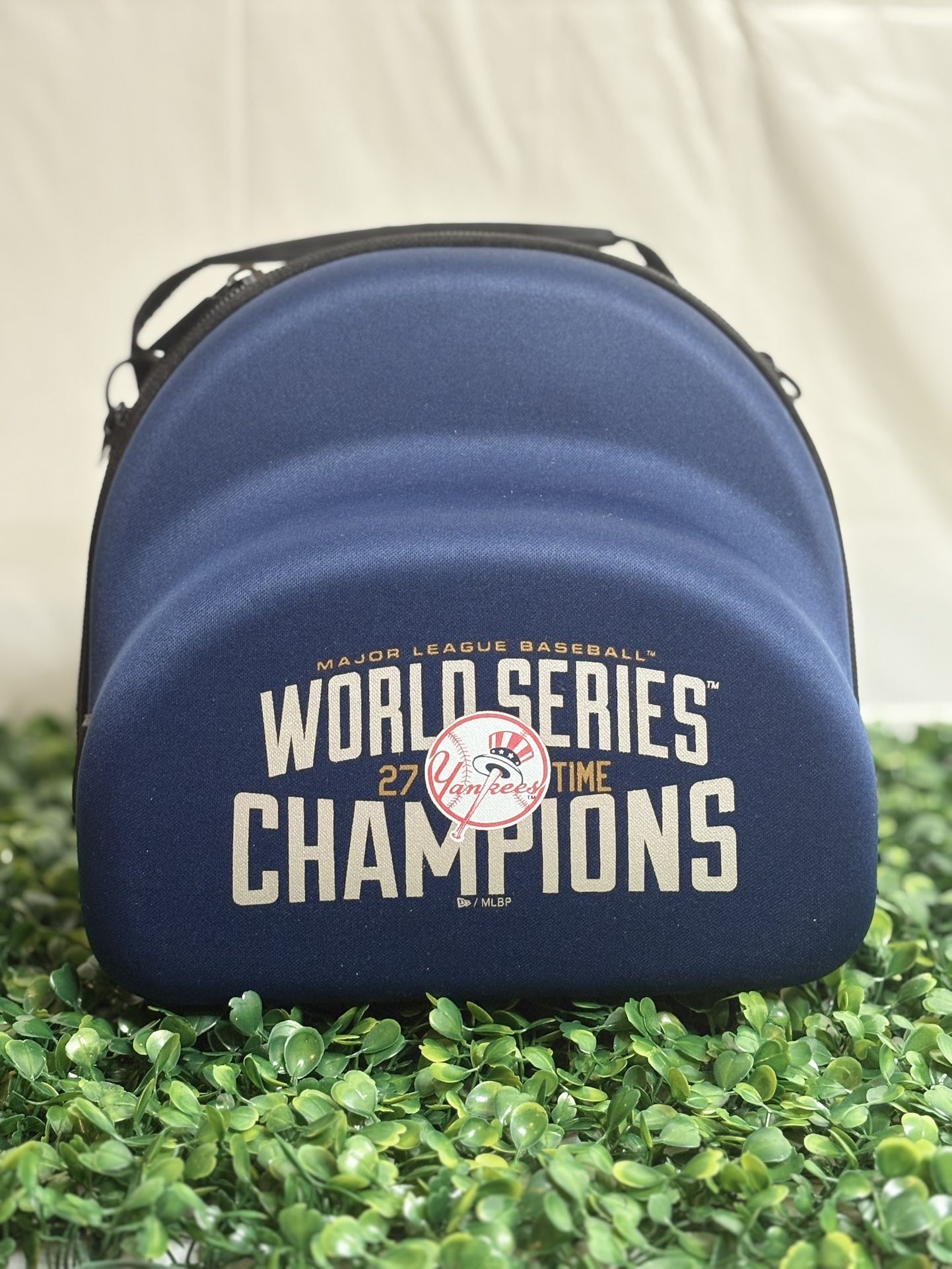 The product is a New York Yankees "Twenty Seven Time Champions" two-pack cap carrier. It is a hard-shell case designed to protect and transport baseball caps. •Features include a handle, a removable shoulder strap, and a double-zip closure. •The carrier has ventilation holes or eyelets to prevent moisture buildup. •The carrier is made of crush-proof EVA foam or neoprene to protect caps from damage. •Officially Licensed