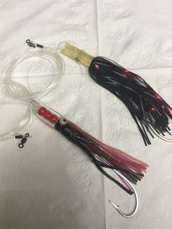 -- Trolling lure rigged with leader and large single hook -- Two for one price -- Single hook rigged with monofilament leader -- Fish and troll for small dolphin and bonito tuna -- Two lures for one price -- 5 inch lures with leader and large hook.