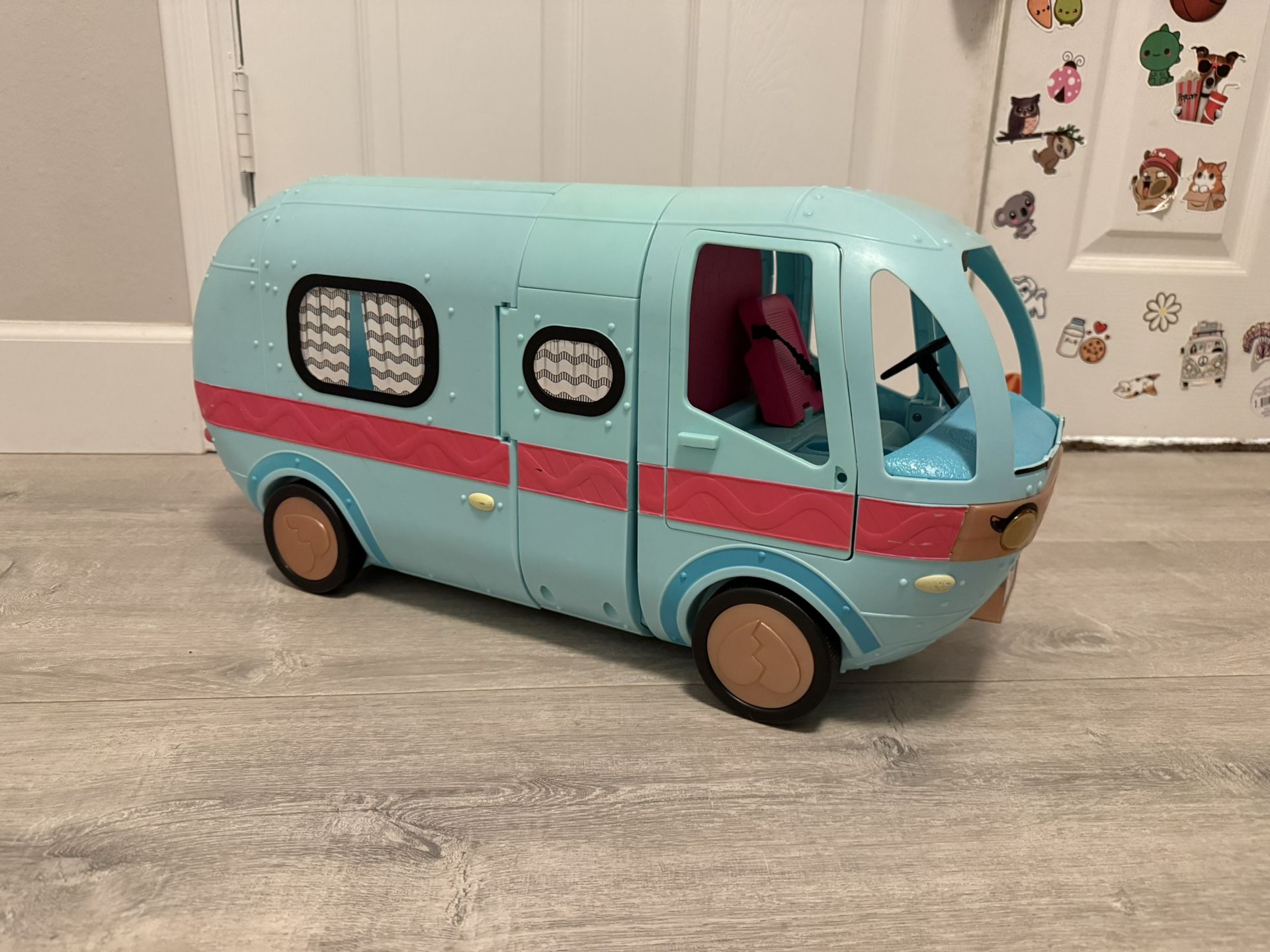 This is the LOL Surprise OMG Blue/Pink Glamper Camper. This fun toy is in excellent used condition with working lights and horn. Some minor wear.