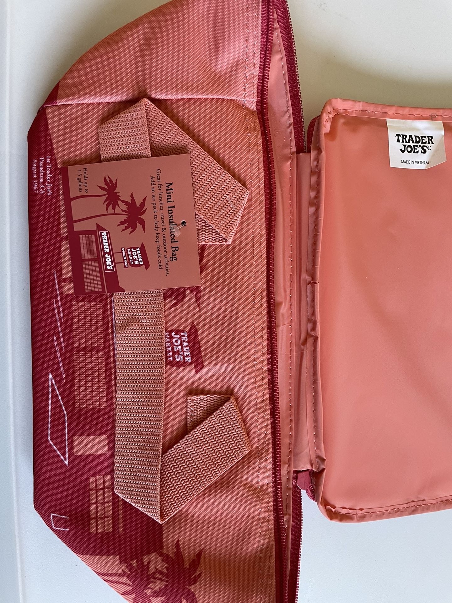Trader Joe's mini insulated cooler bag. Features a zip top closure, insulated interior, and sturdy carry handles. Lightweight and easy to carry
