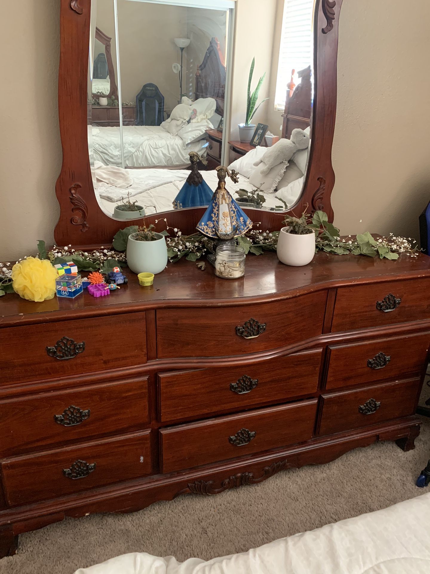 Queen bed with 2 nightstands and dresser with mirror and other dresser