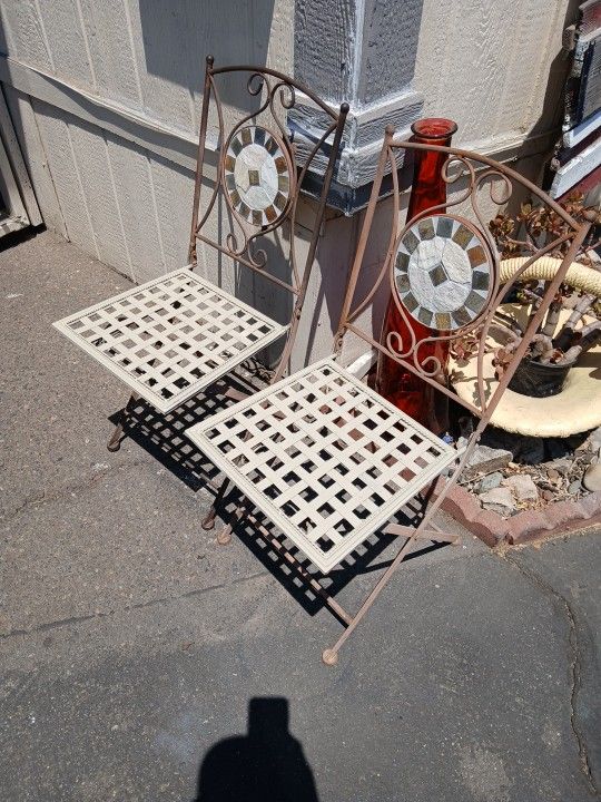Great looking vintage Wrought iron Folding chairs with stone backs, both in excellent condition, only $55 for both