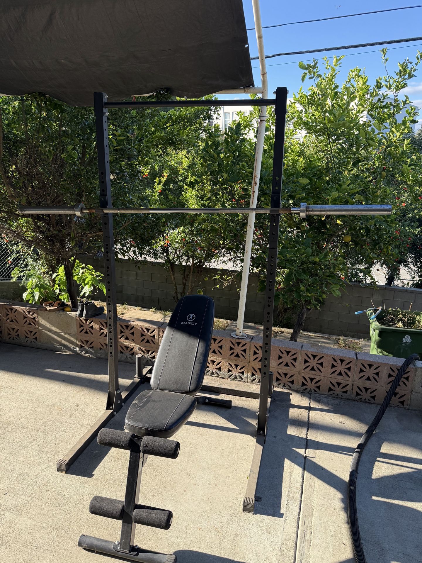 Squat rack, barbell 45 lbs and bench