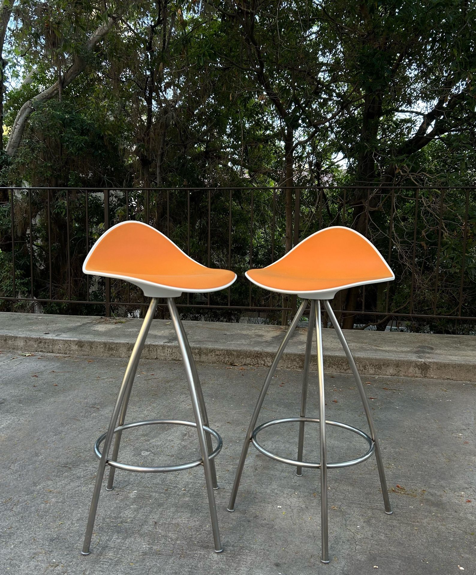 Gorgeous set of 2 orange & white counter stools / barstools. Super cool & in VERY great condition, like new—just cleaned them up yesterday. This company still makes similar barstools (for $700+ each new) but they don’t make reproductions of this colorway anymore! Such a nice set of counter stools / barstools. Seat Height (highest point): 27” 1/4” Footrest Height: 8” 3/4” Back Height: 32” 3/4” Pick up in LA or delivery available with a fee!