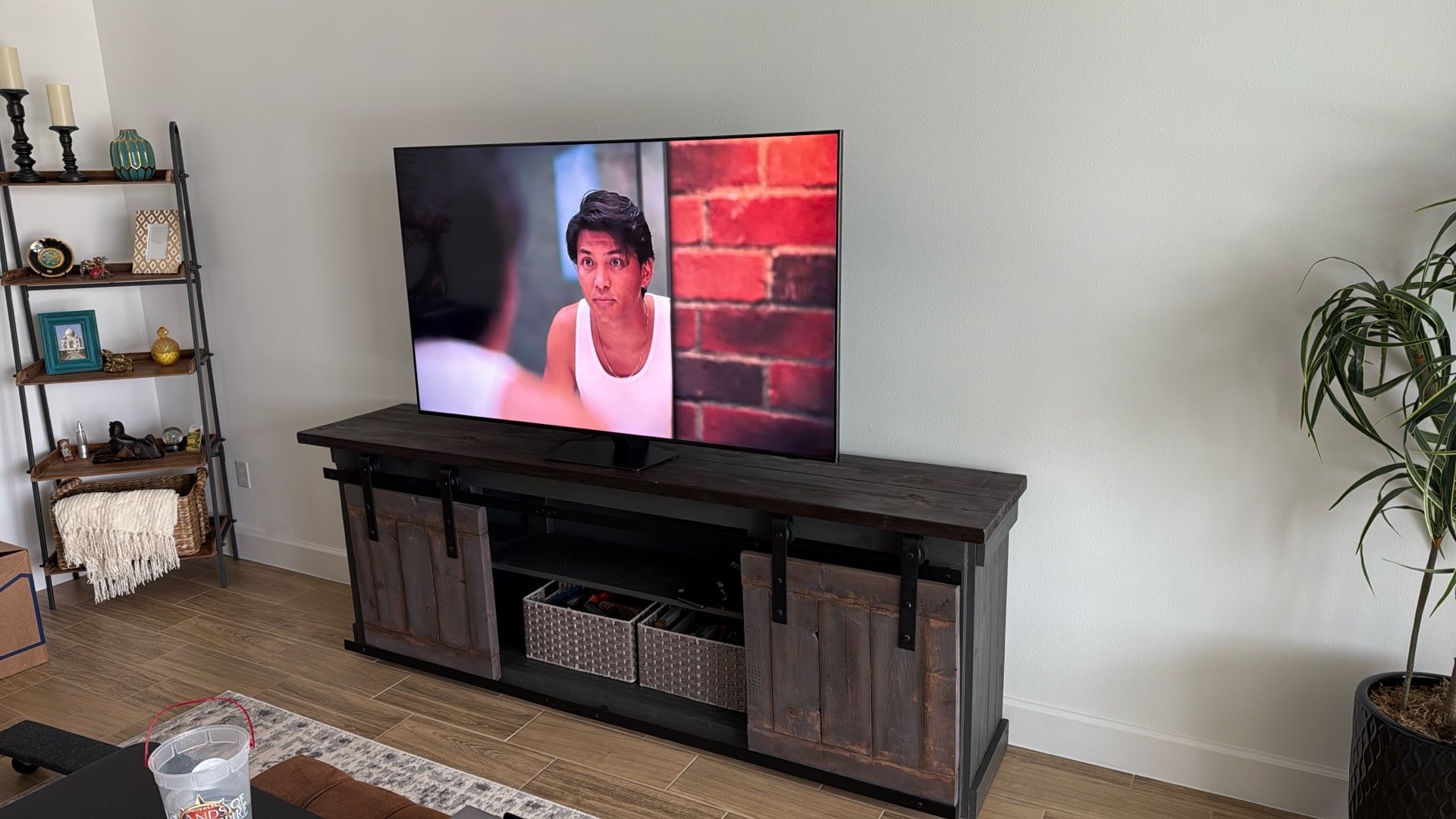 Solid wood, custom entertainment center with barn-style sliding doors. TV does not convey. Can hold any size tv. Solid!! 89” wide, 18” deep, 32” high.