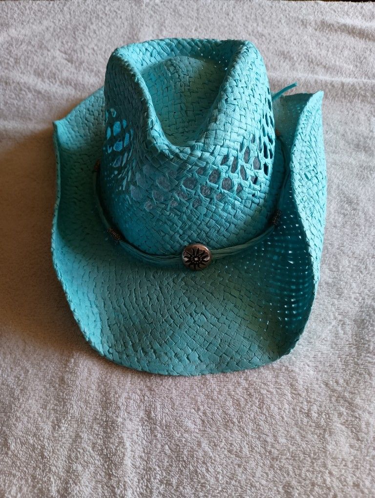 Milani Turquoise 100% Straw Western Cowboy Hat in good condition. There is a silver plated sun dial and other silver plated designs around the bottom of the crown. Designed in Italy Color is Turquoise Measurements Crown = 5.50" Brim = 3.50" Circumference = 21"
