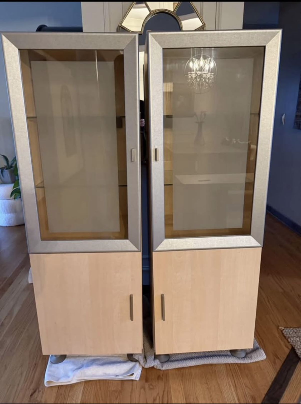 Great condition, two storage living room office cabinets, each 58" tall by 19" wide by 17" deep. Glass shelves inside, lights up. Asking $200. Located in Schaumburg.