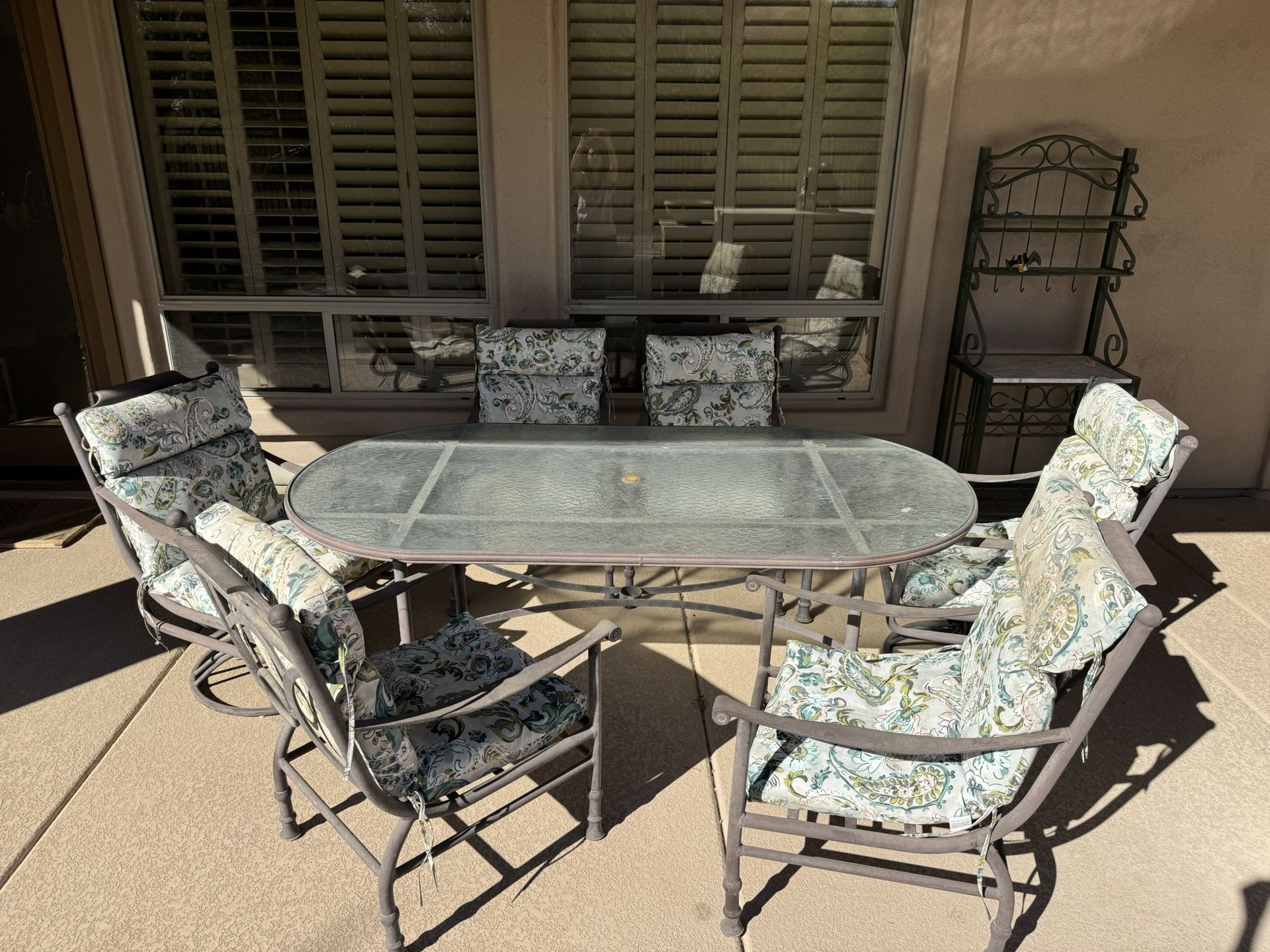 Heavy wrought iron table with 6 chairs Table measures 84” x 42” 2 swivel chairs & 4 stationary chairs Original price was $5k Asking price reflects faded paint Still in excellent condition otherwise Located in N Scottsdale- 101 & Bell Must be able to pick up and transport