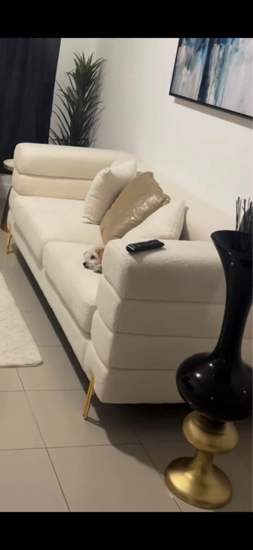 Beige two piece set of sofas. Sherpa sofas. Gold feet. One long and one short.