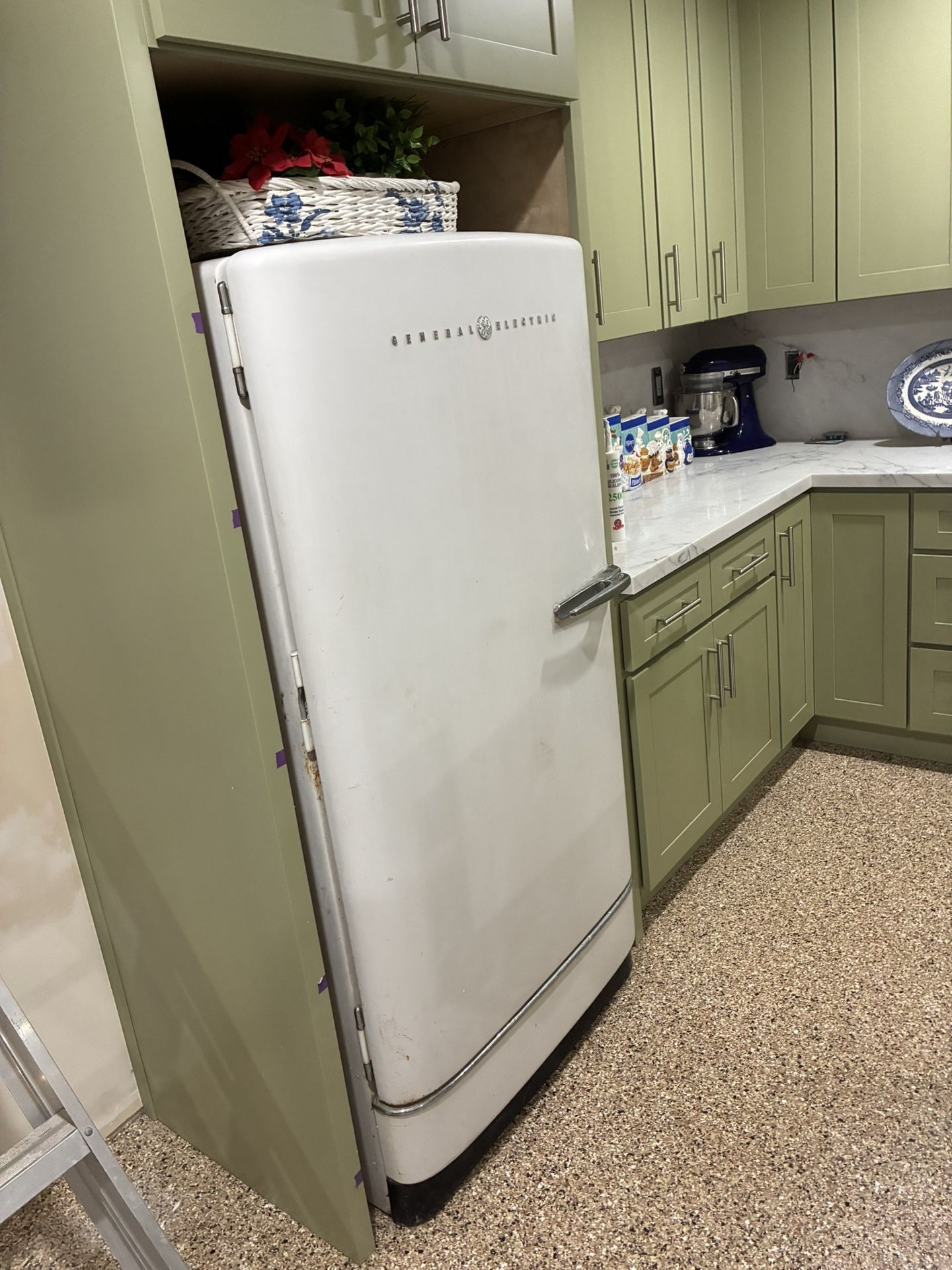 Refrigerator,Stove,Formica Table with 8 matching Chairs and one Hoosier Cabinet.