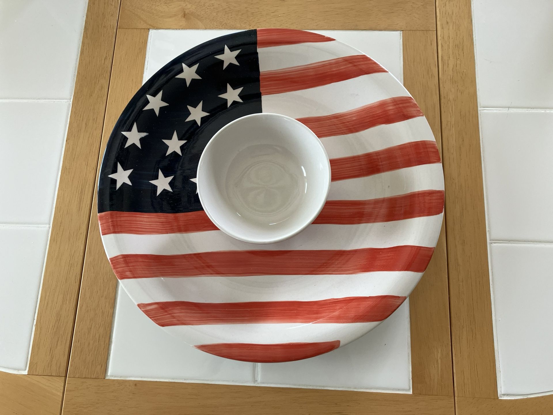 2 pc American Flag Design 14” Ceramic Platter & Bowl Set. Cash & Porch Pickup Only