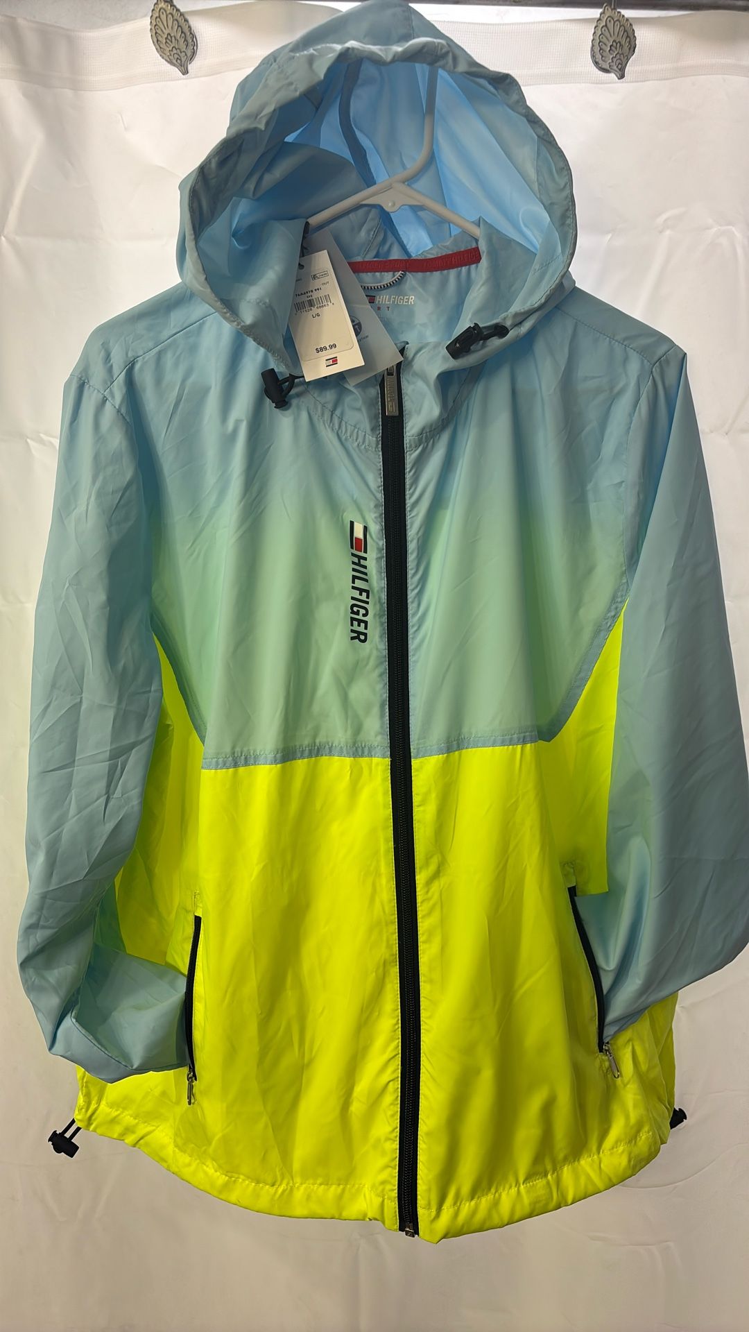 Women’s baby blue and fluorescent yellow hooded, very lightweight windbreaker. NWT.