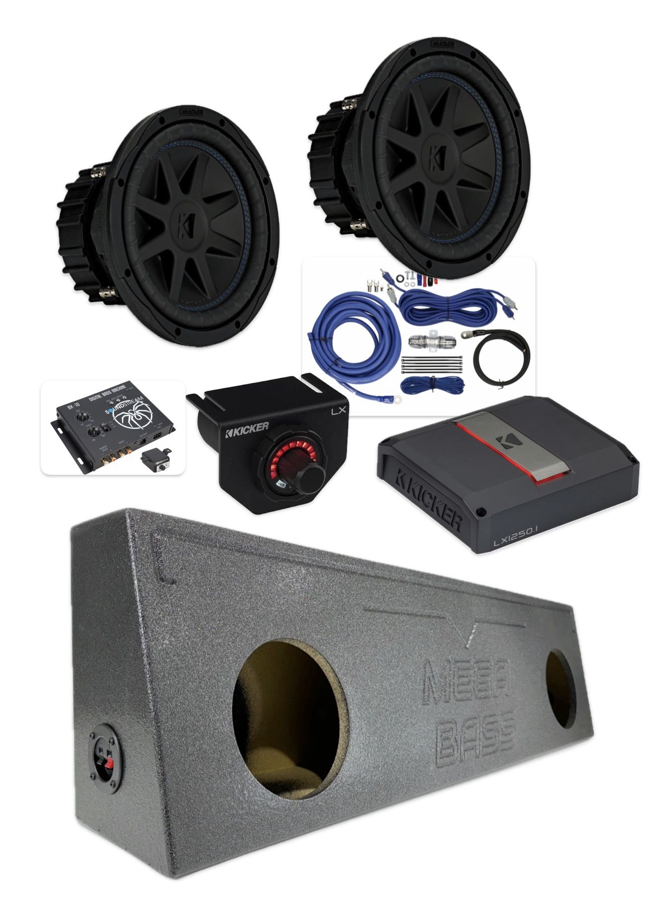 $1700 Firm Brand new Labor installation included Fit single cab trucks 2 kicker CVX 10” subwoofers 2400 watts 1200 rms Ported box Kicker lx series amplifier Bass knob Epicenter Amp kit wires Installed Keywords alpine kenwood kicker pioneer Rockford Memphis mtx jl audio hifonics sundown audio skar audio ds18