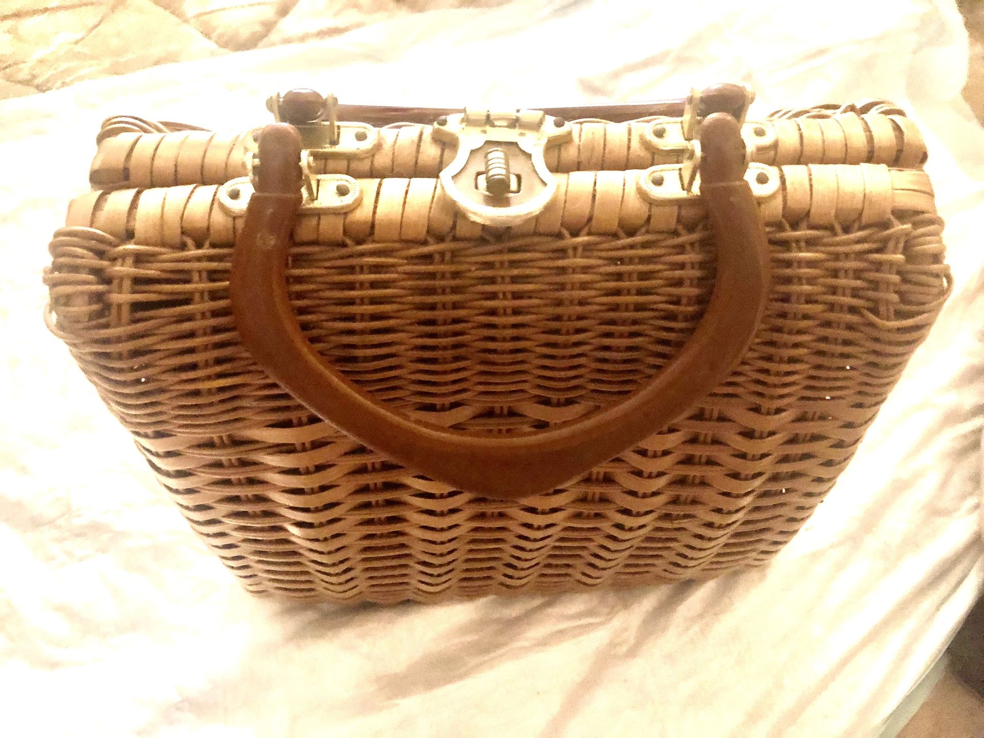 Vintage HANDMADE IN HONG KONG, Hand Woven Wicker Purse with Bakelite Handles, Brass Closure and Brass Bottom Buttons….Excellent Condition …Measures 9 1/2” Wide, 9” Tall and 5” Deep…A Wonderful and Unique Find in My Aunts Closet