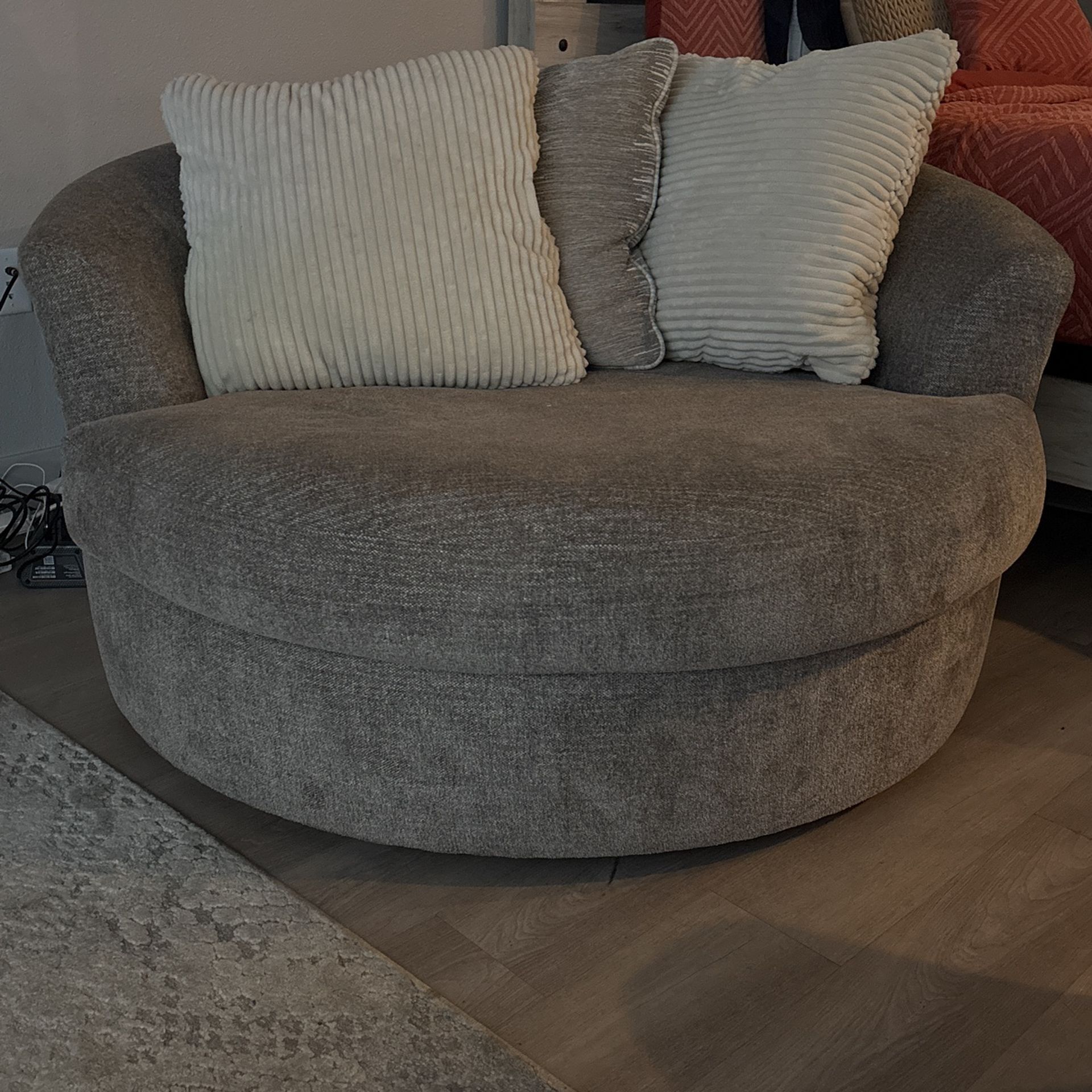 Lightly used. Could use upholstery cleaning. Pillow covers removable for cleaning. Circumference: 56 in (give)